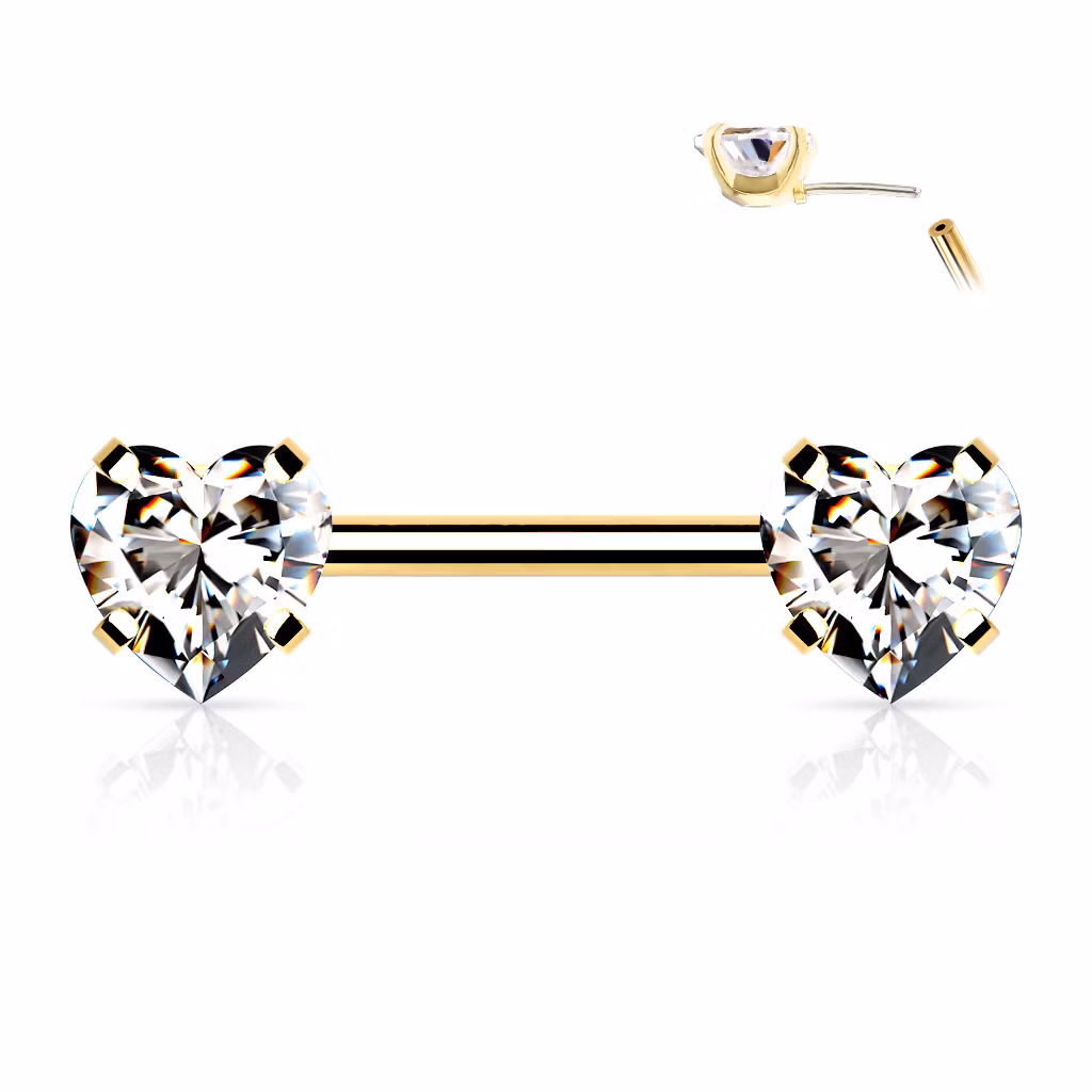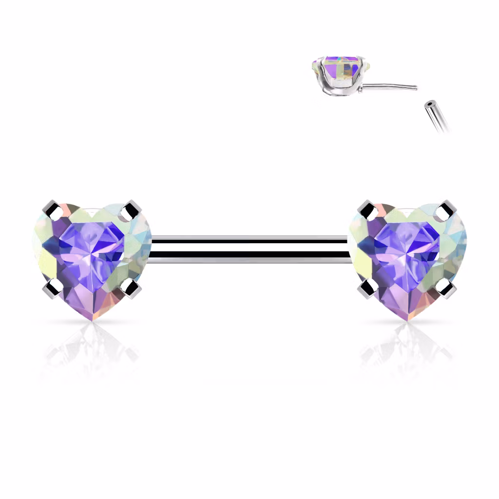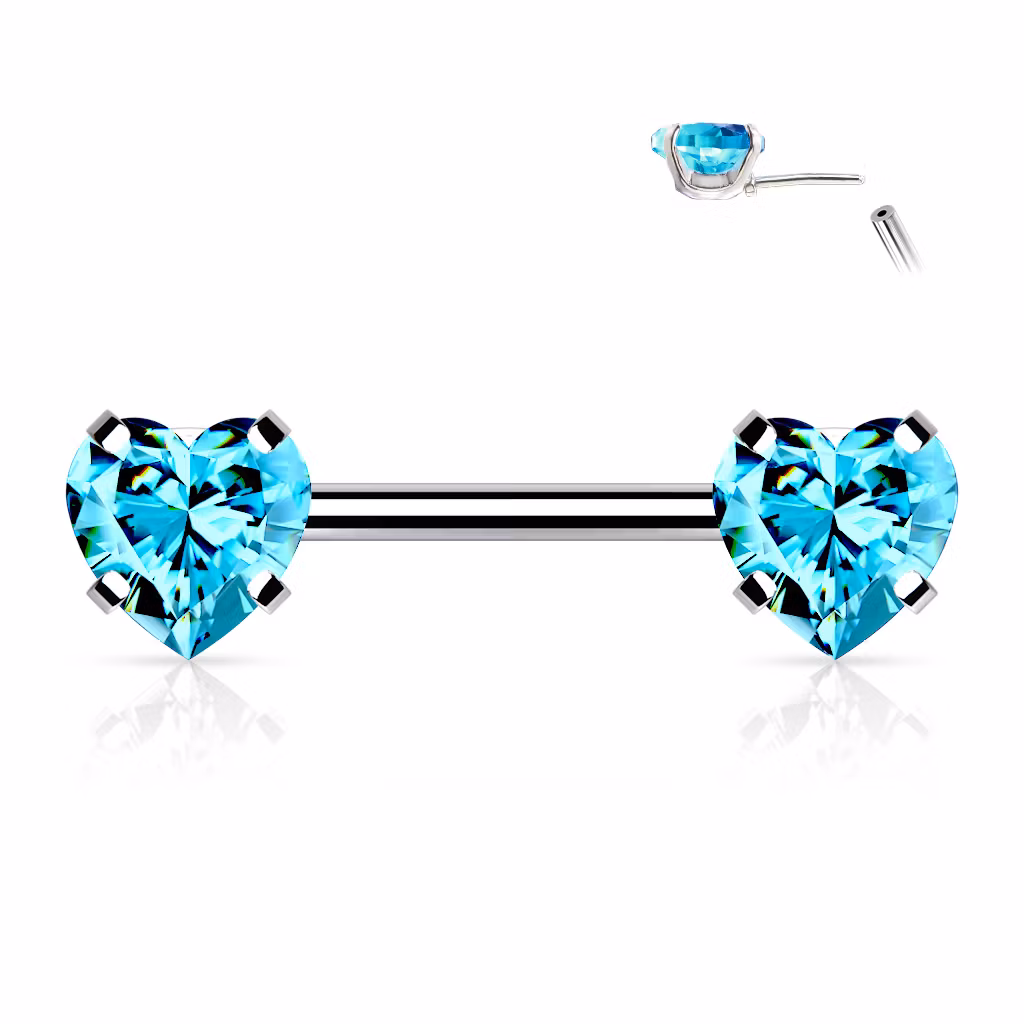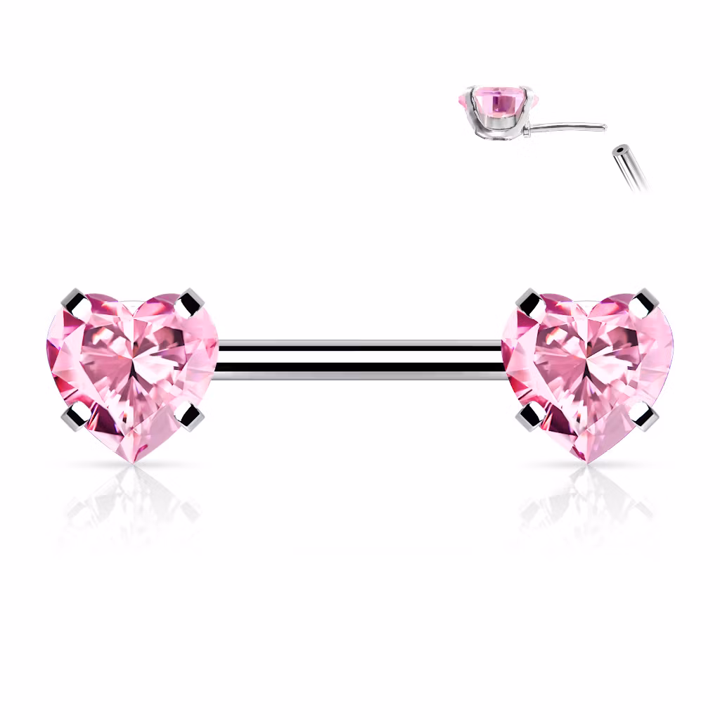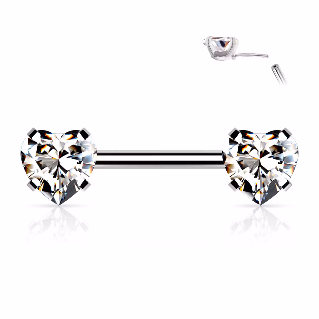 Threadless barbell för piercing i bröstvårta - kirurgiskt stål 1,6mm med hjärtformade kubisk zirconia