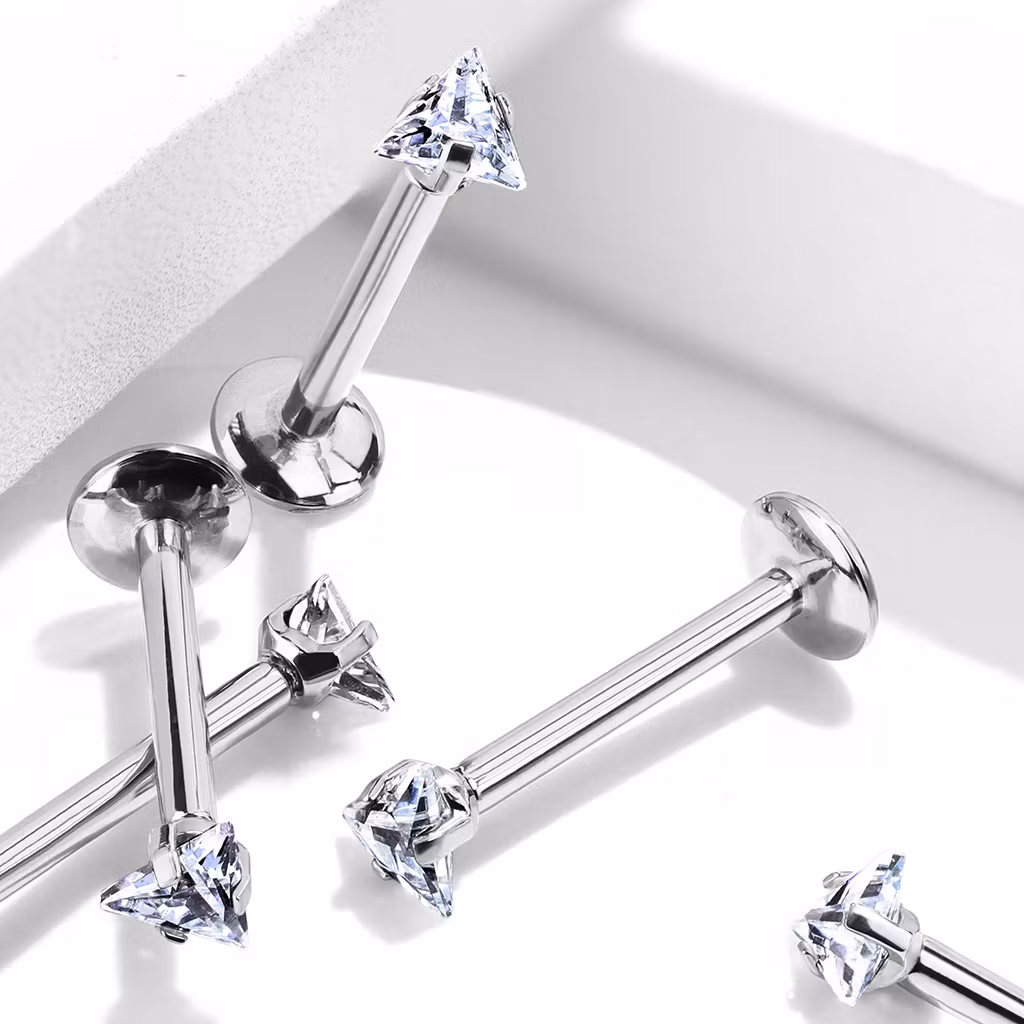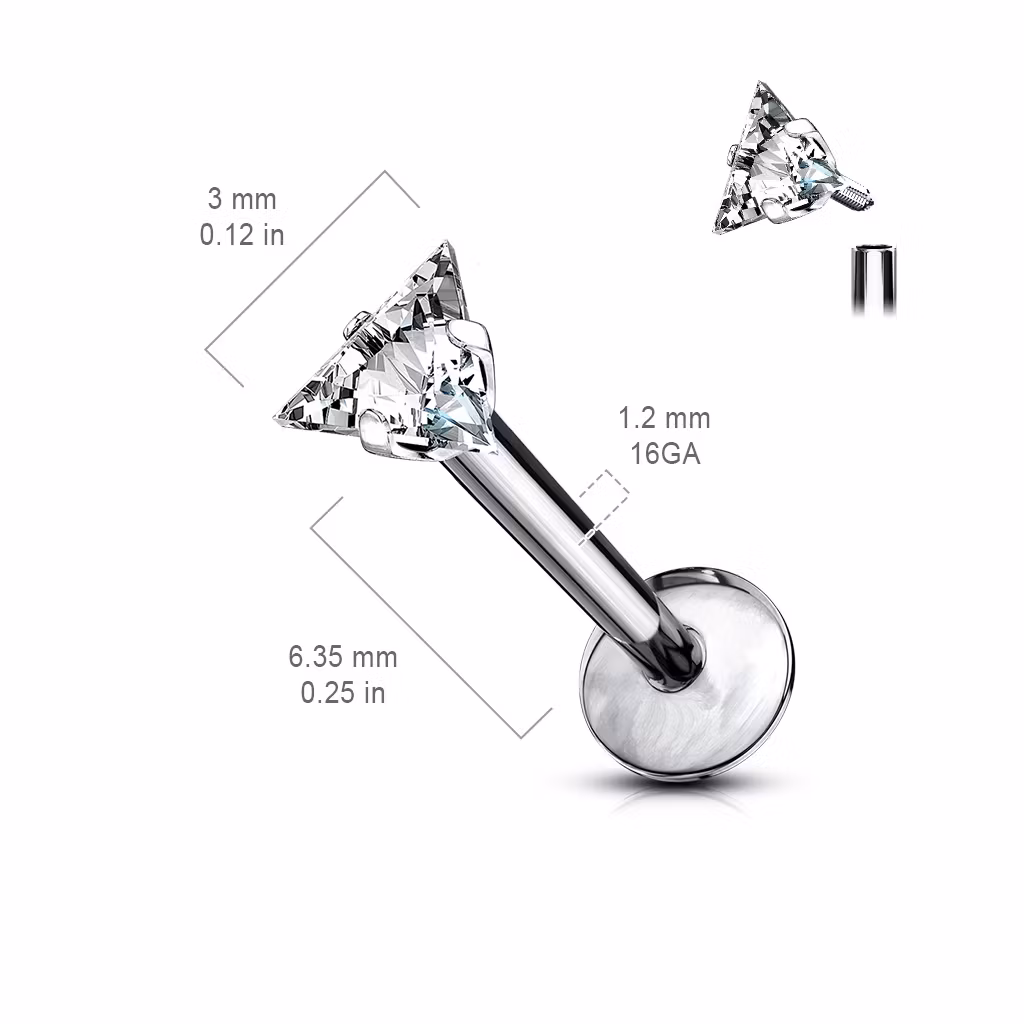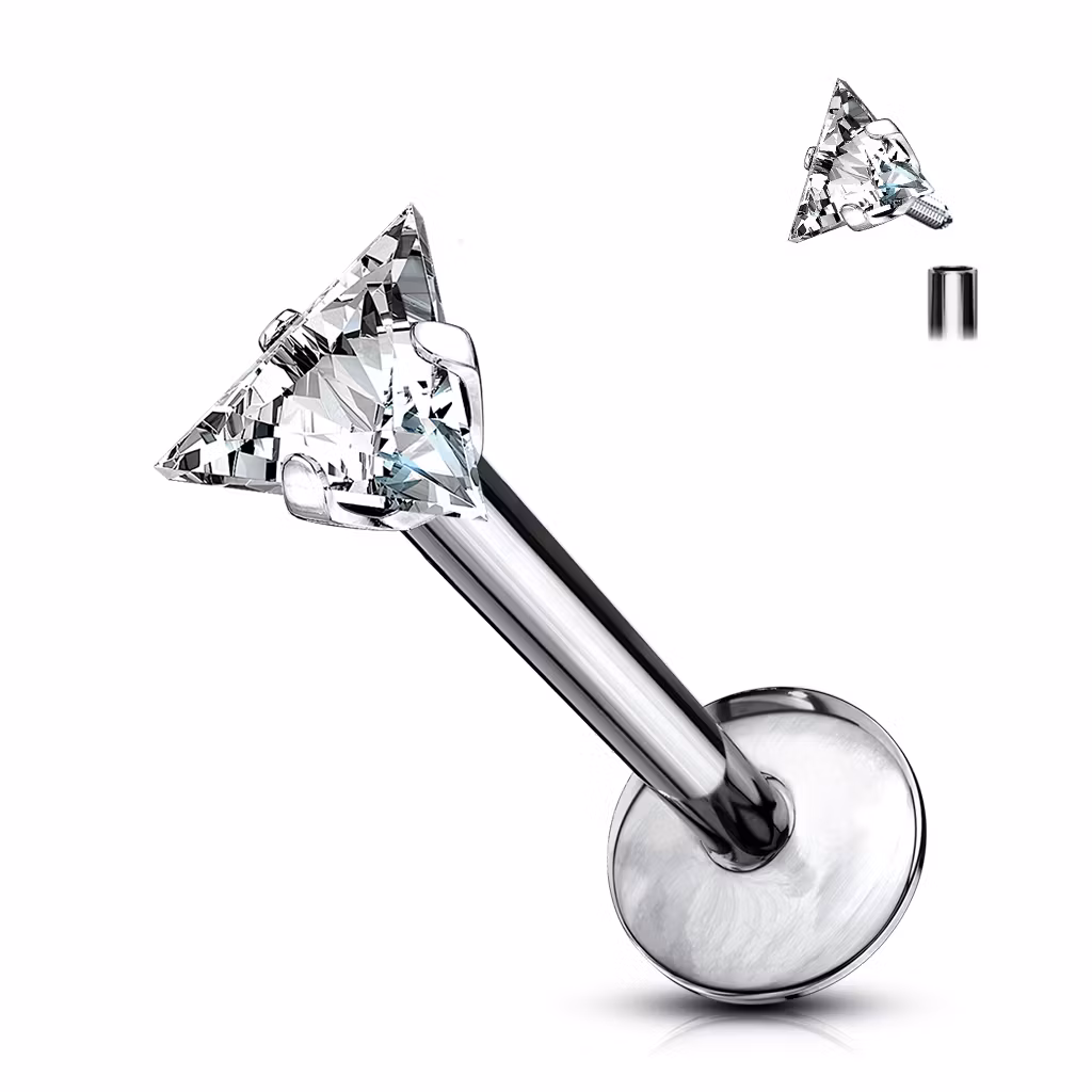 Labret / flat back piercing i titanium 1,2mm med triangelformad kubisk zirconia