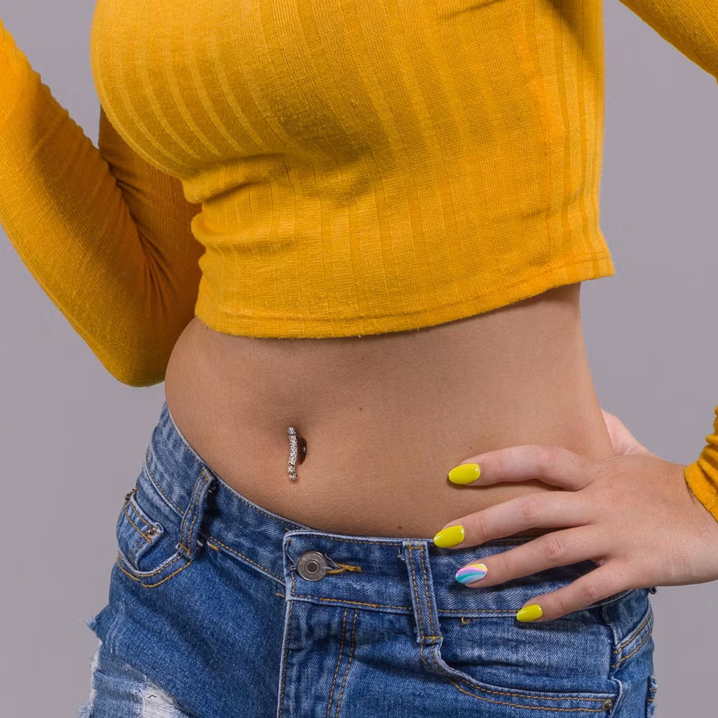 Navelsmycke banana i 316L kirurgiskt stål. Smyckesdelen är pläterad mässing. 8st fyrkantiga kubisk zirconia i hänge.
