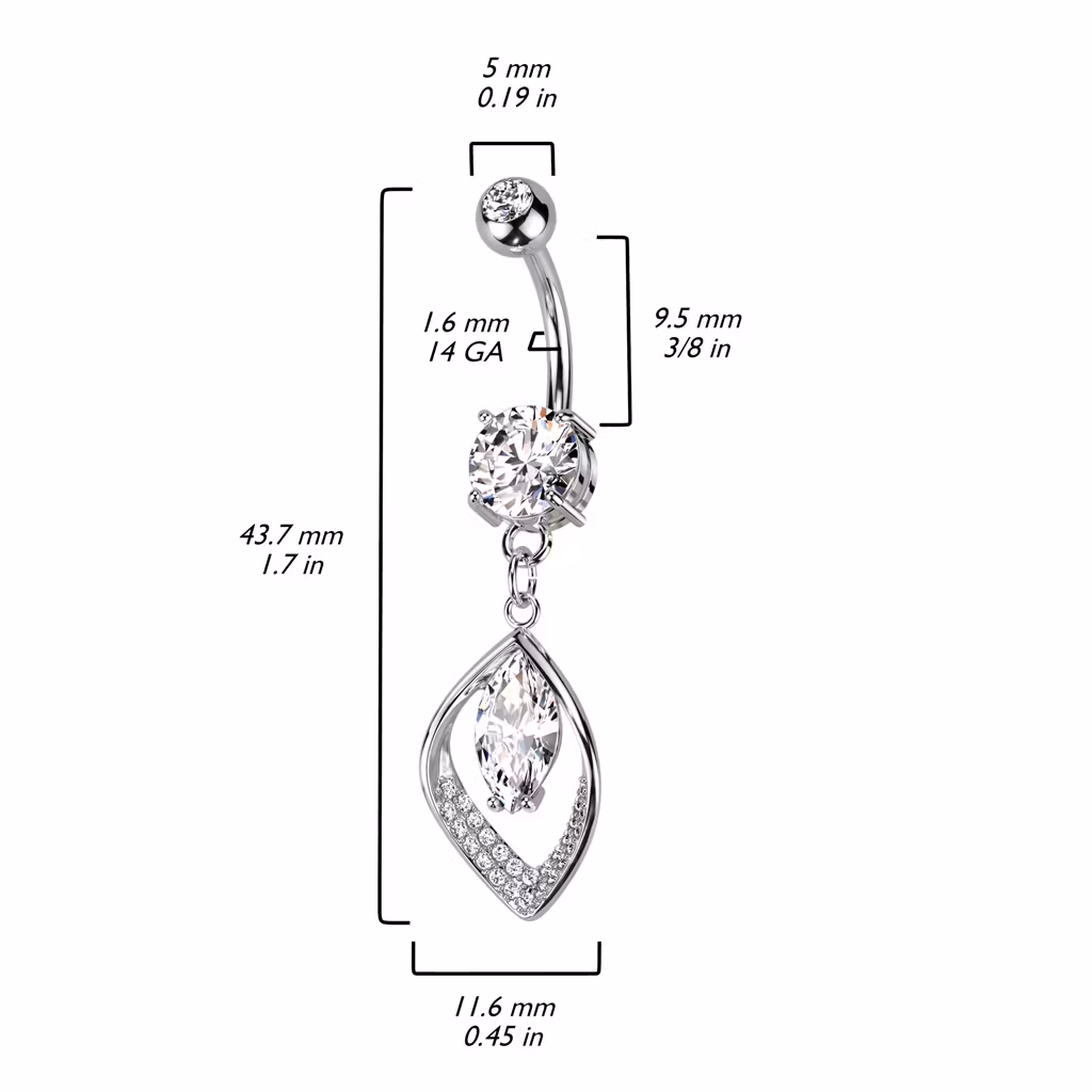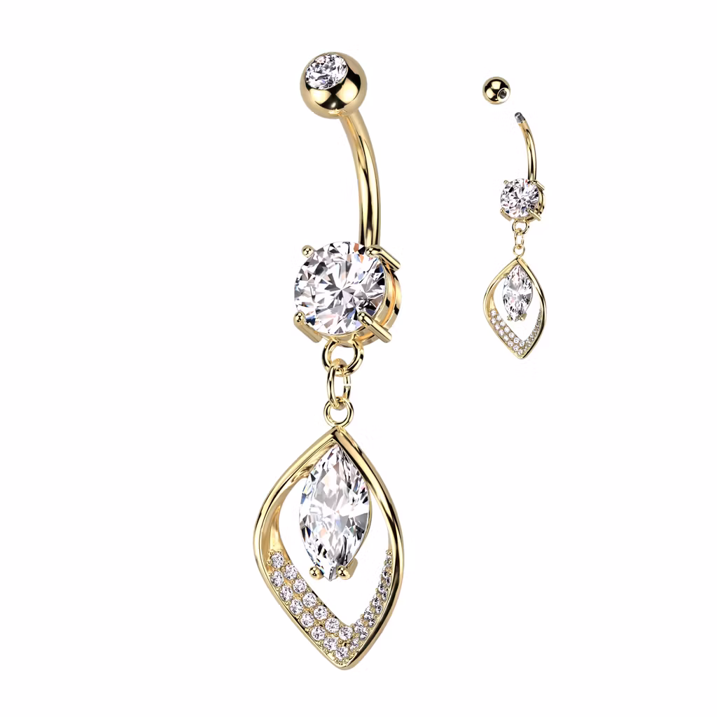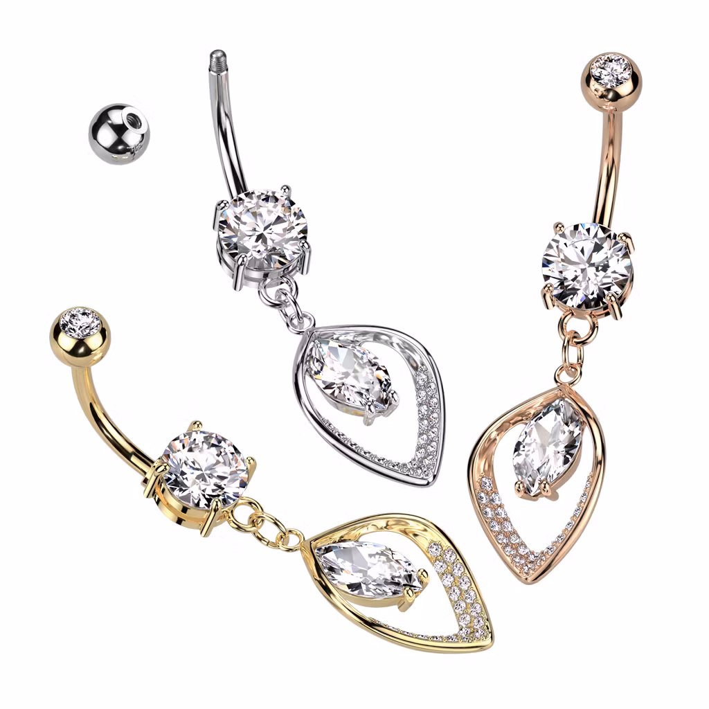 Navelsmycke banana 1,6mm med lövformat hänge med kubisk zirconia