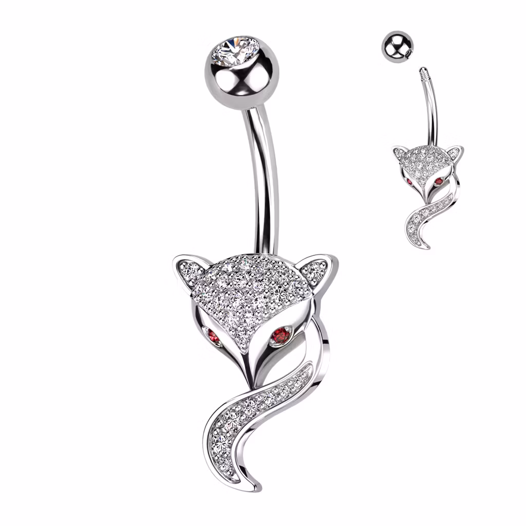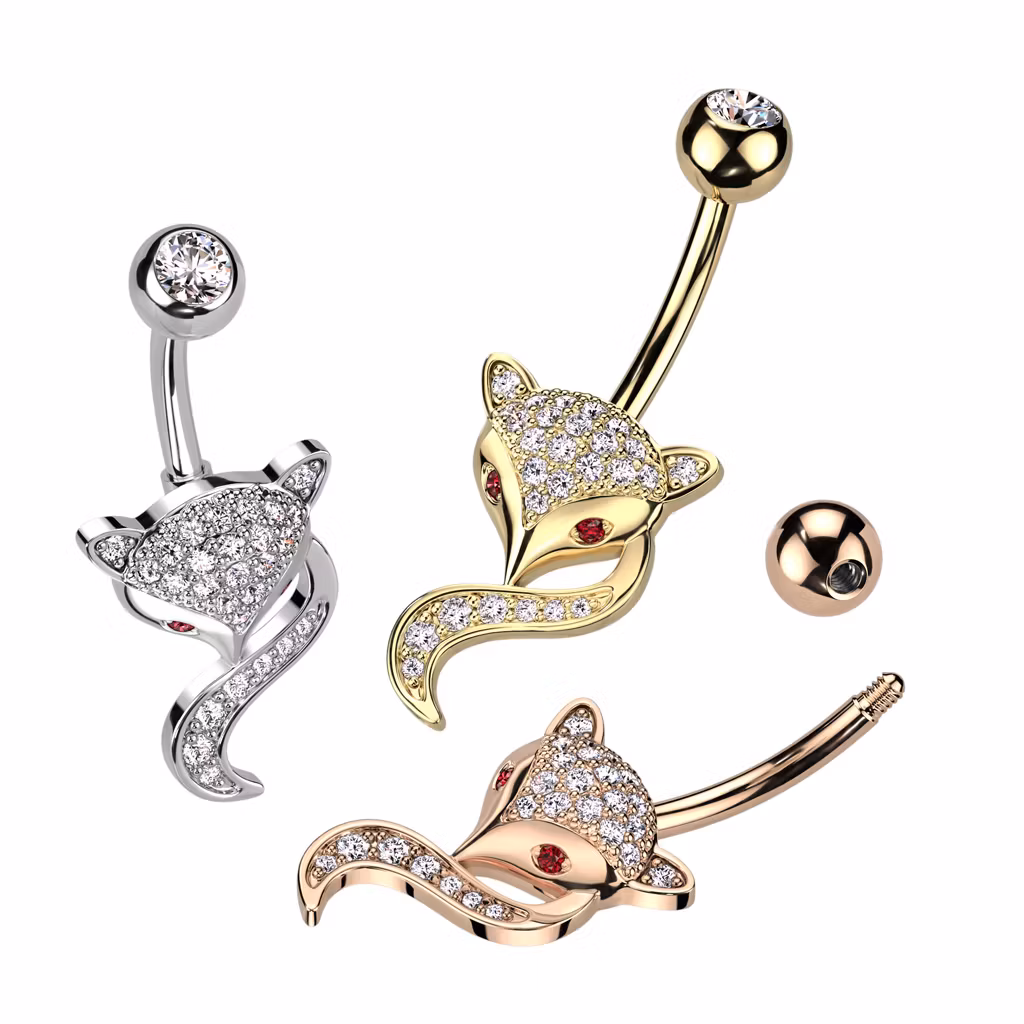 Navelsmycke med banana i 316L kirurgiskt stål. Räven är tillverkad i pläterad mässing.