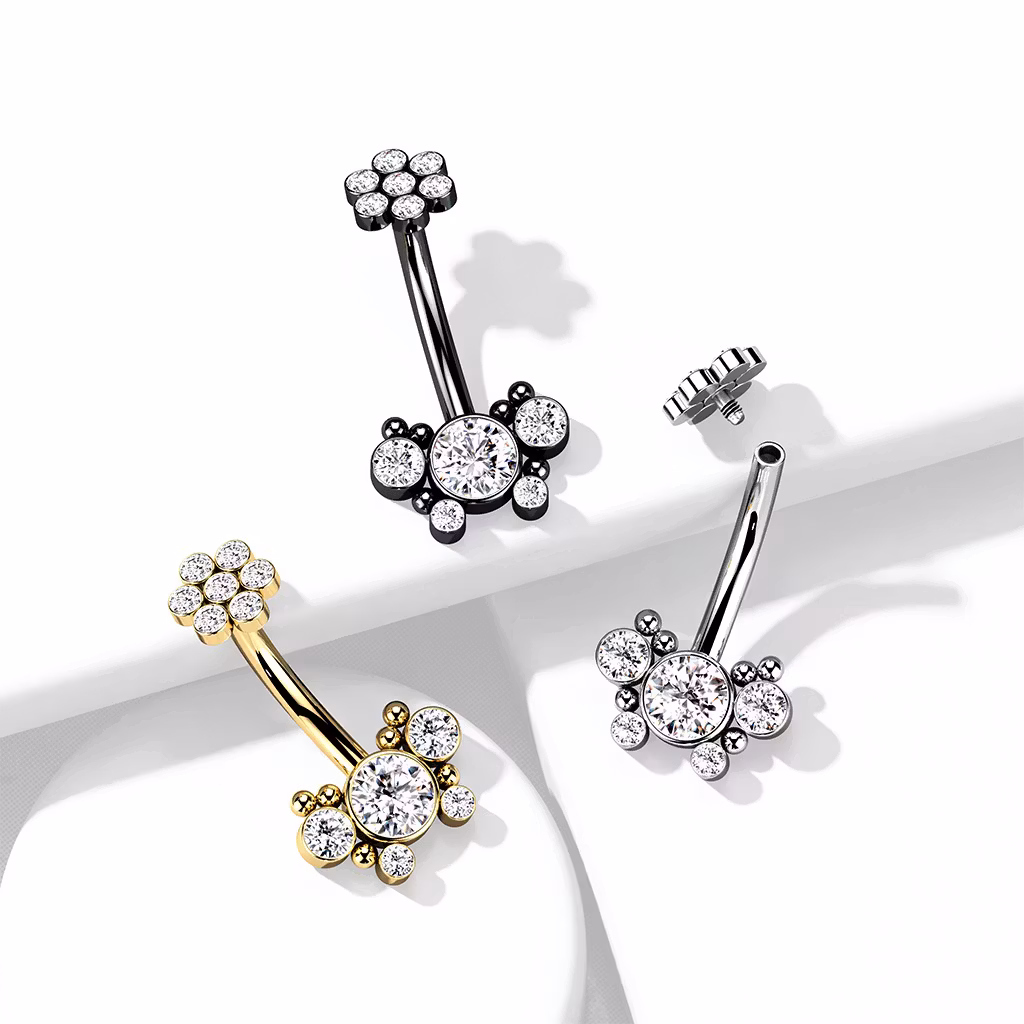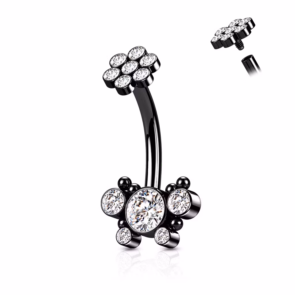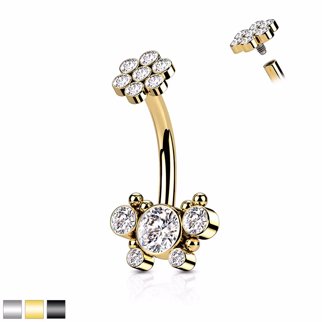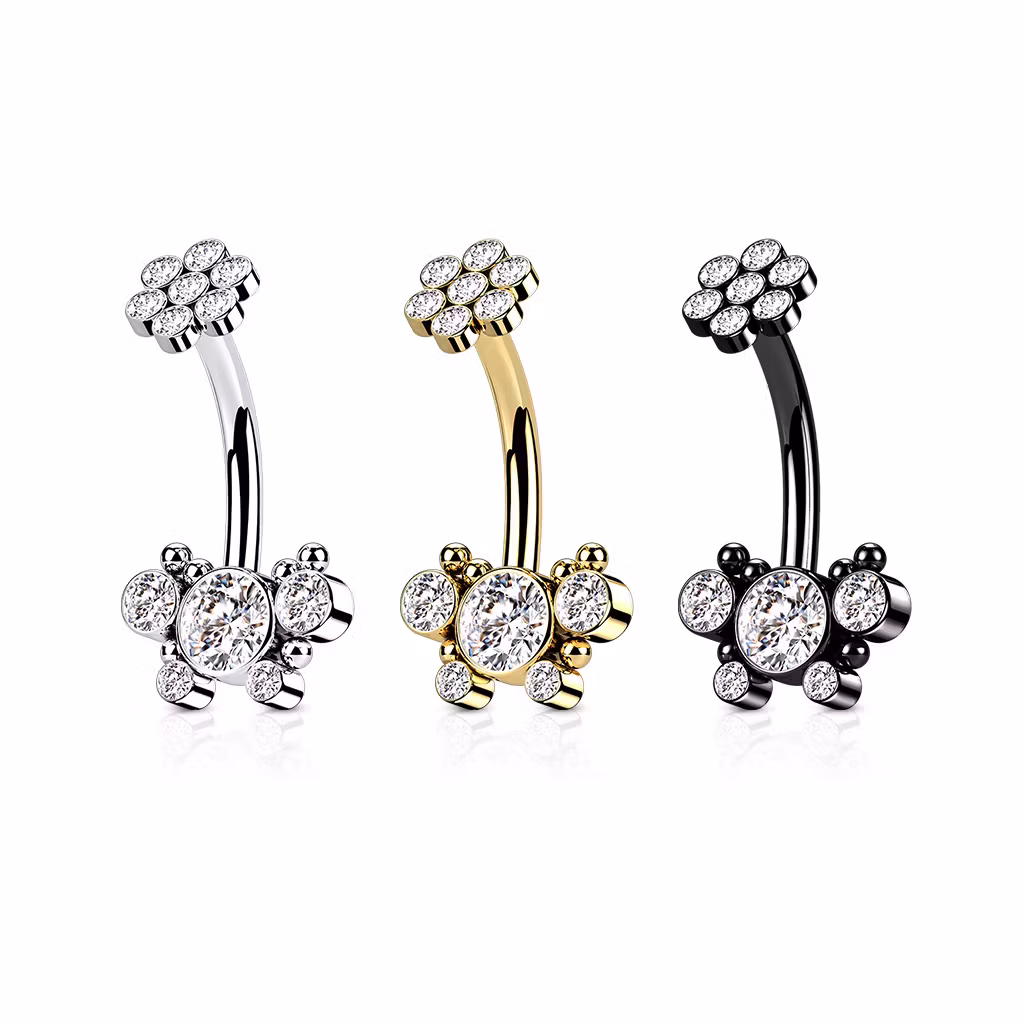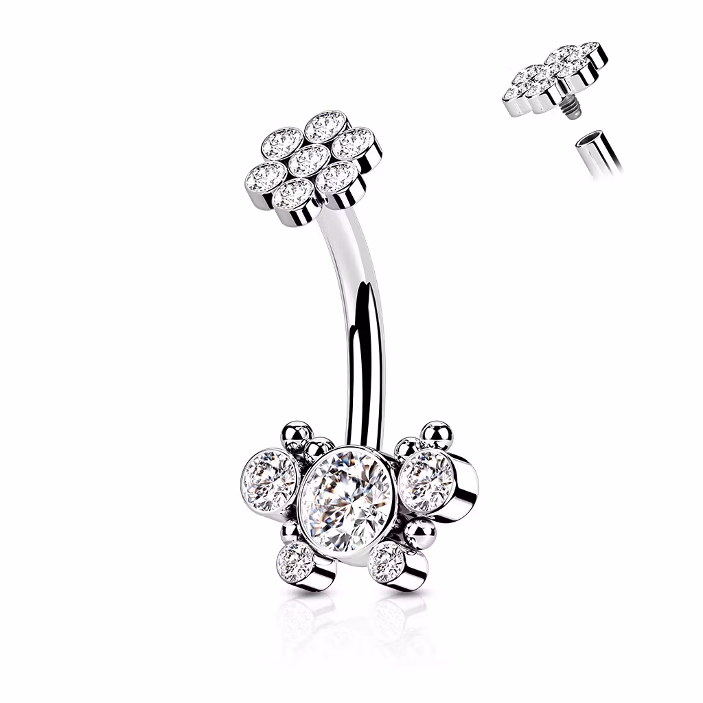 Navelsmycke i kirurgiskt stål 1,6mm invändigt gängad med kubisk zirconia blomma och fjäril