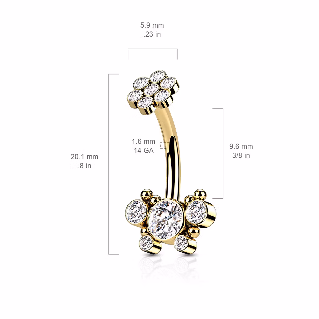 Navelsmycke helt i 316L kirurgiskt stål. 14gauge - 1,6mm. 10mm lång mätt rakt över. Invändigt gängad banana för att minska obehag vid byte. De färgade modellerna är PVD-pläterade. Fjäril med kubisk zirconia i botten och topp i form av en blomma med kubisk zirconia.
