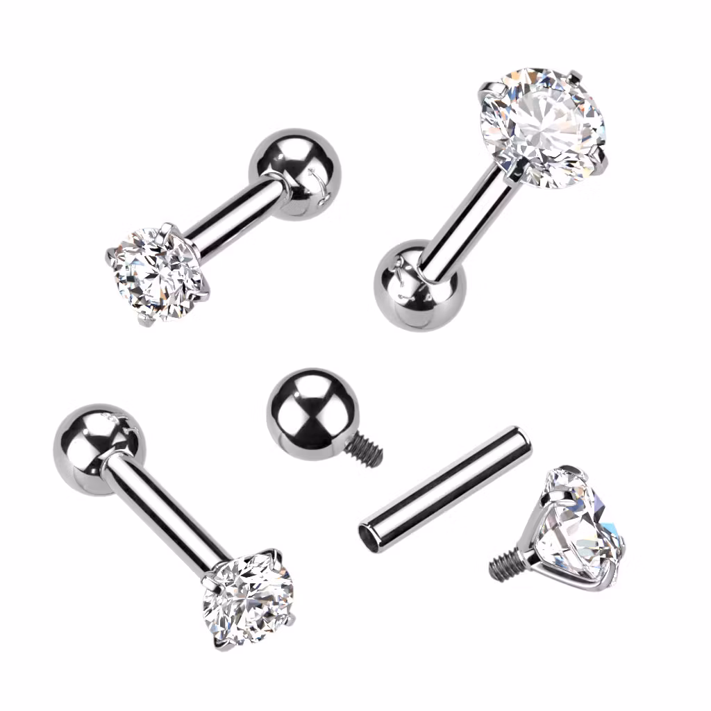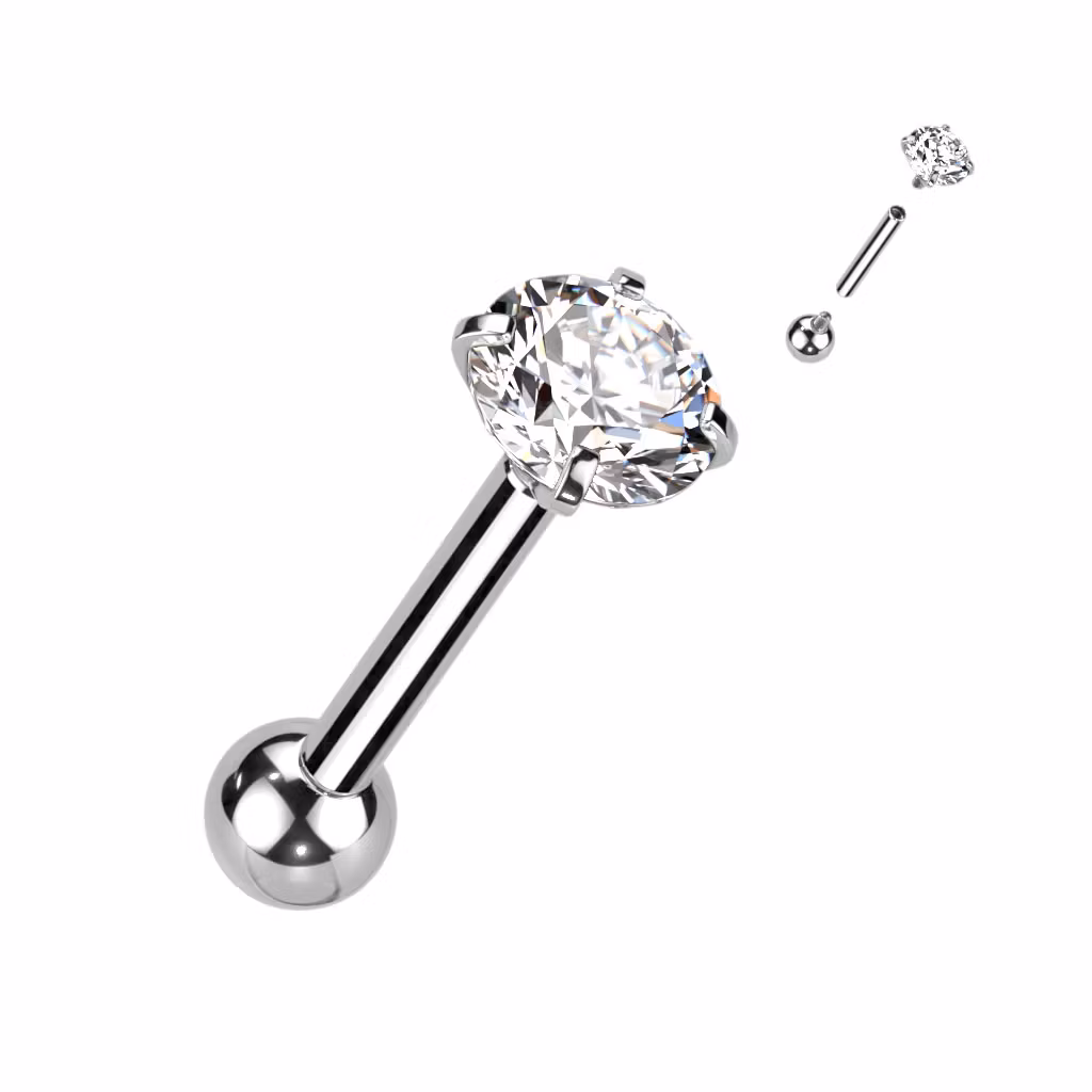 Barbell i implantatsäker ASTM-F136 Grade 23 Titanium. Staven är invändigt gängad och finns som 18gauge - 1,0mm eller 16gauge - 1,2mm. Längden mäts rakt över utan kulor och finns i 6mm eller 8mm lång. 3mm kula och kloinfattad klar cubic zirconia. Passar bland annat helix och tragus piercing