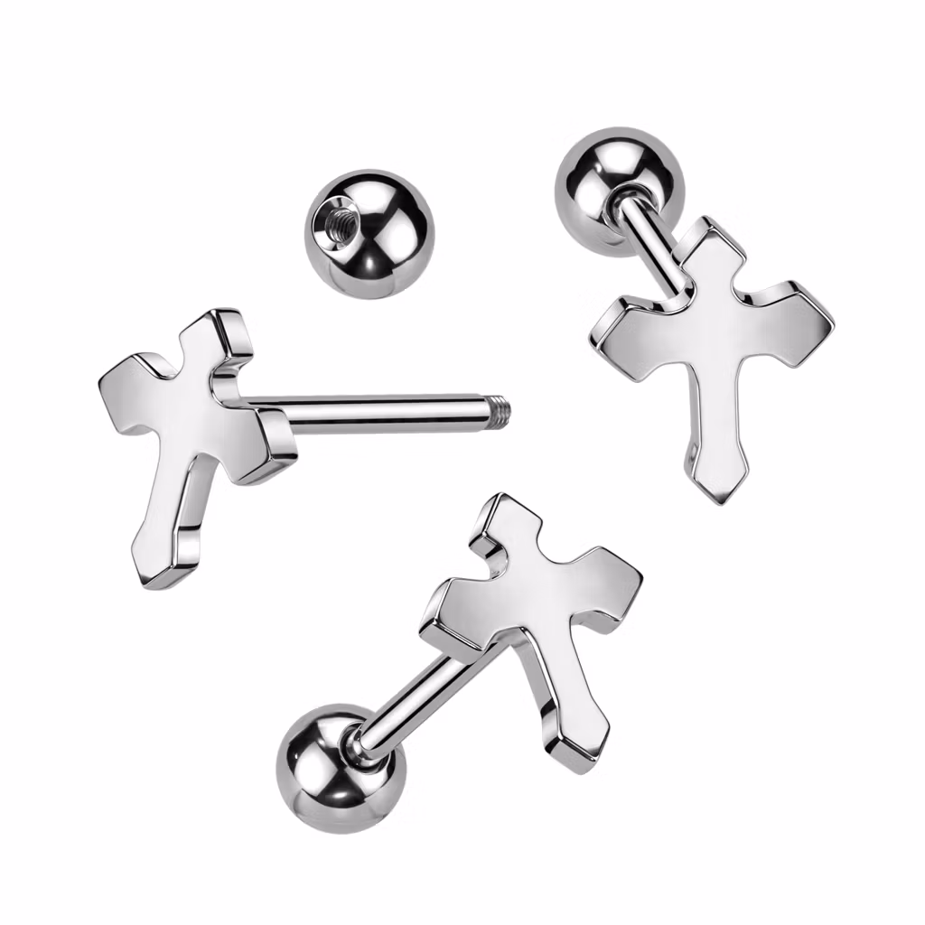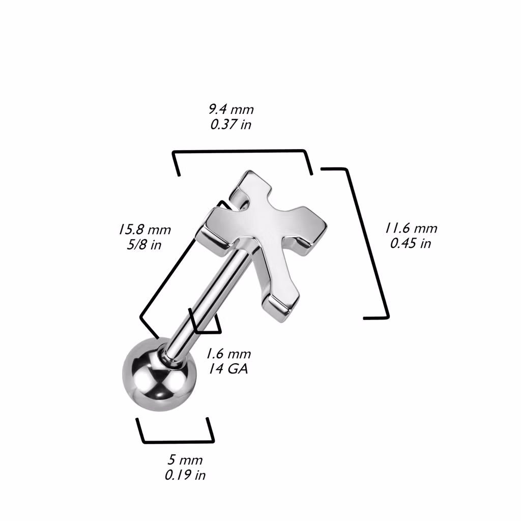 Barbell i 316L kirurgiskt stål. Passar exempelvis i tungpiercing. 14gauge - 1,6mm. Längden är 16mm och mäts utan kula och topp. 5mm kula. Kors 9.4mm x 11.6mm.