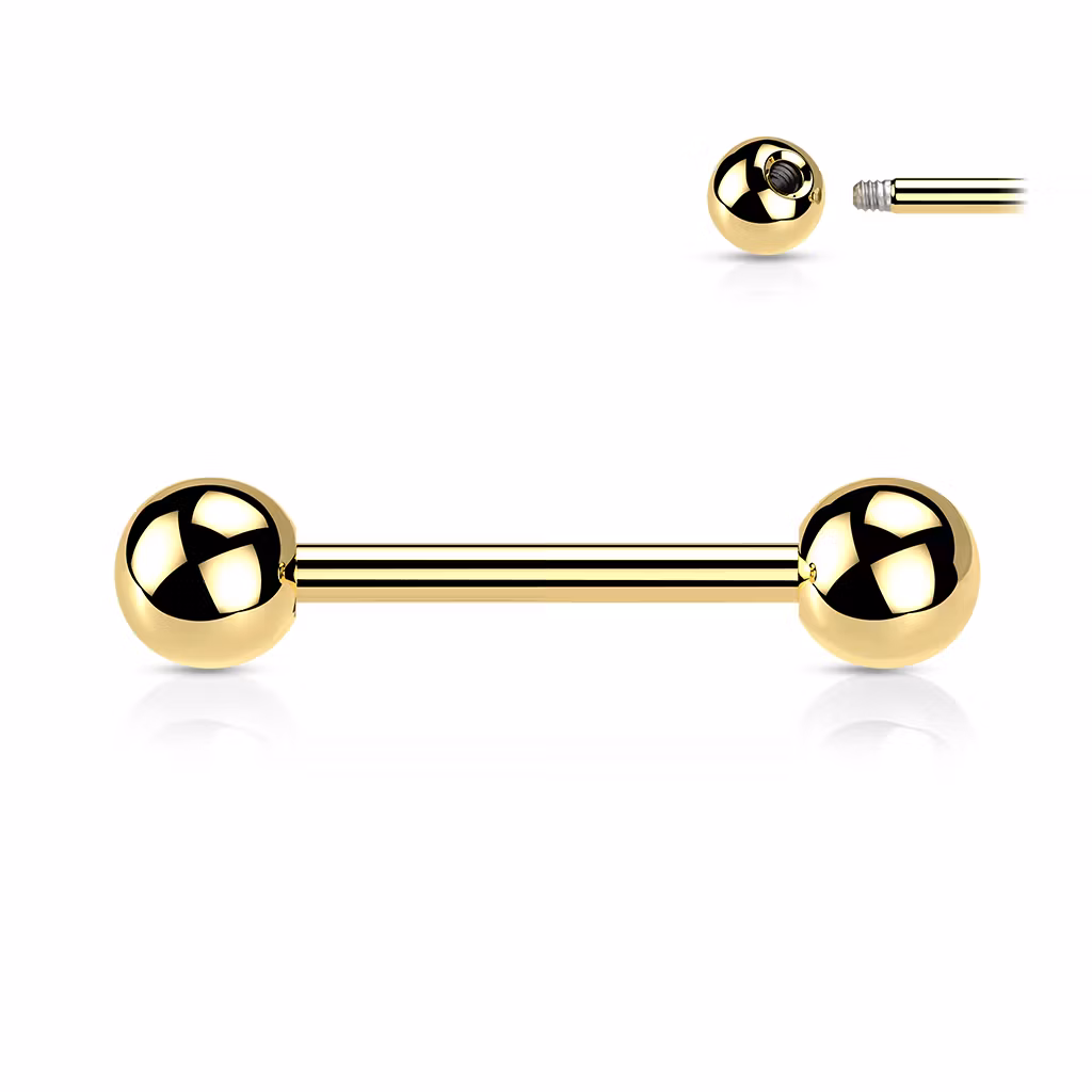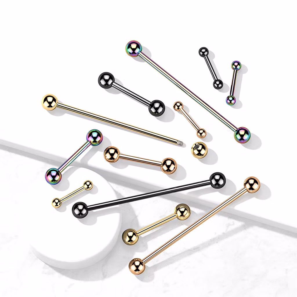 Barbell / rak stav tillverkad helt i implantatsäker ASTM-F136 Grade 23 Titanium. Utvändigt gängad stav med kulor i vardera ände. PVD-pläterad. Längden mäts utan kulor och gänga.