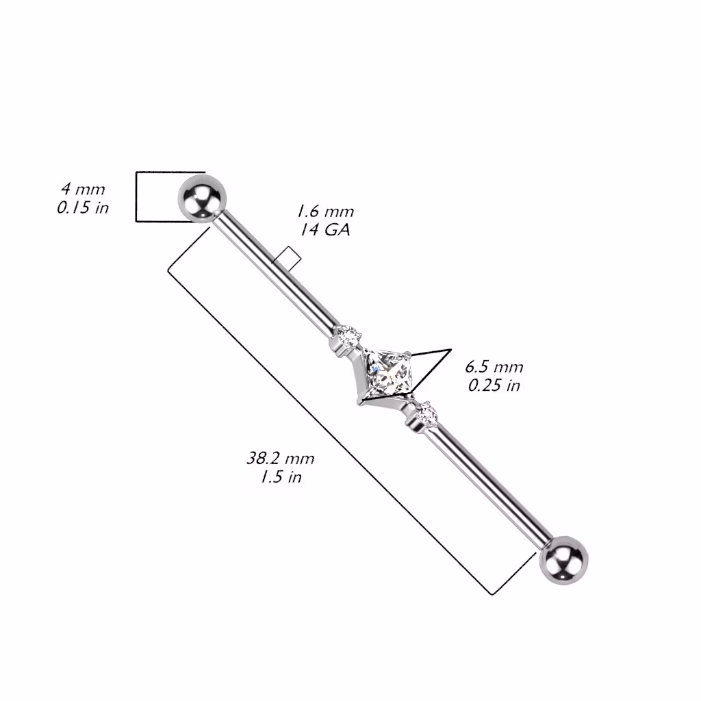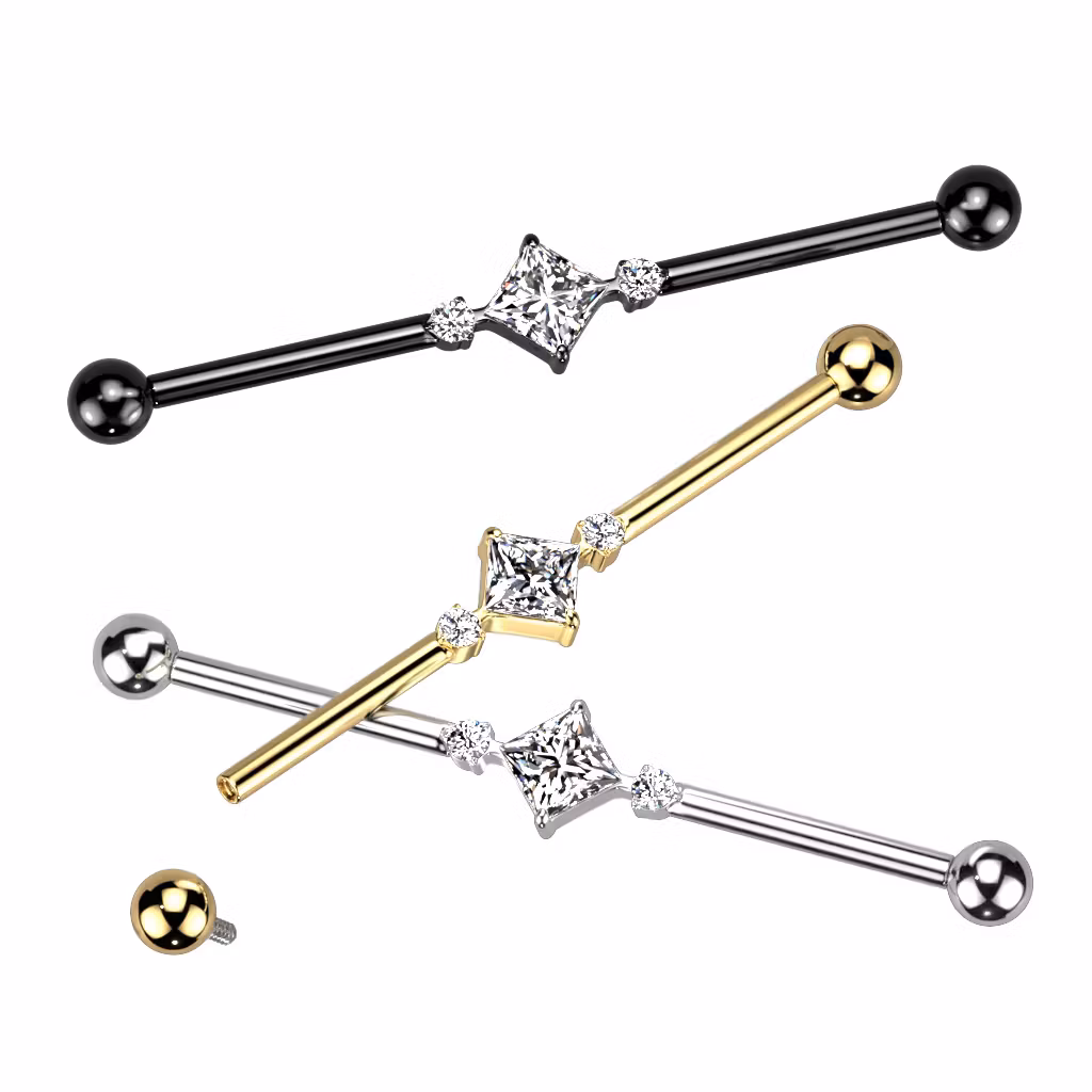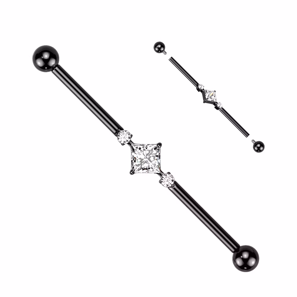 Industrial barbell helt tillverkad i implantatsäker ASTM-F136 Grade 23 Titanium. Invändigt gängad rak stav med 4mm kulor i vardera ände samt en centrerad fyrkantig kubisk zirconia och två runda kubisk zirconia på sidorna.