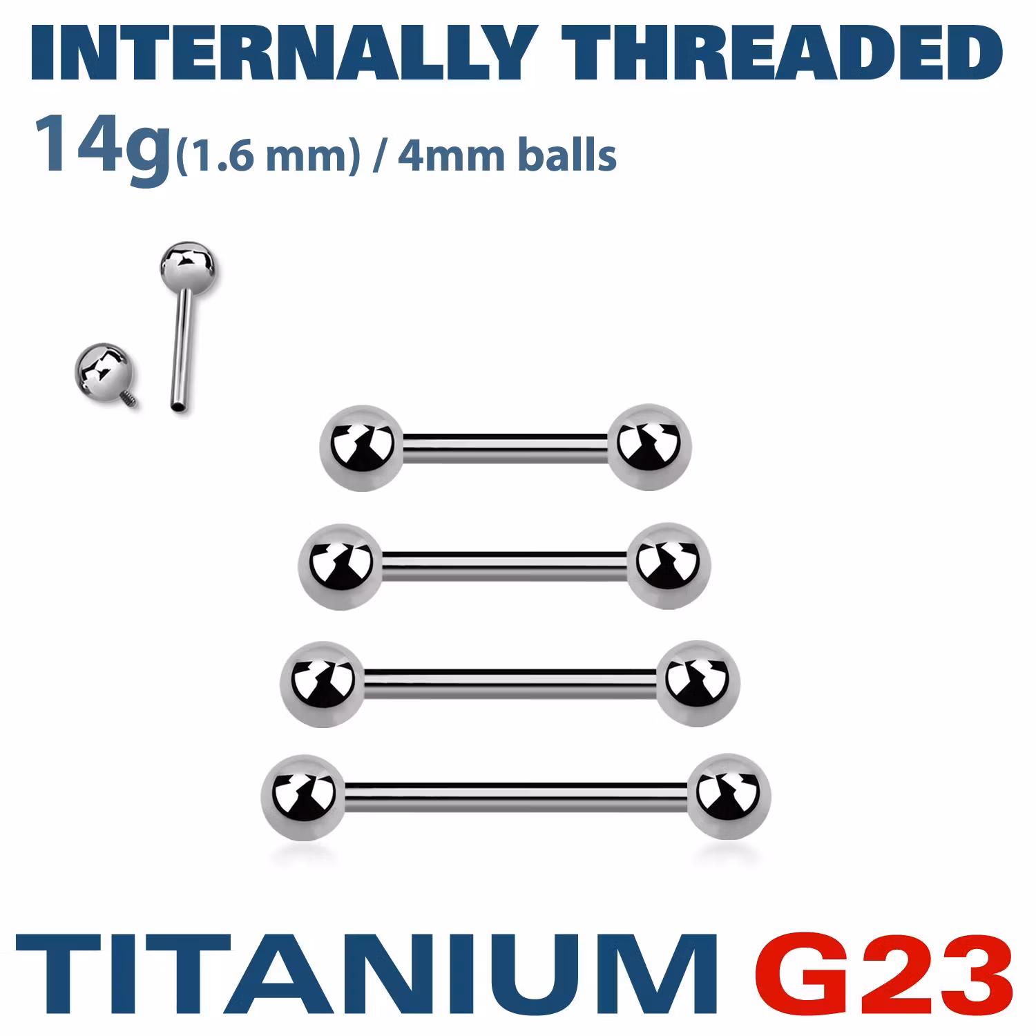 Barbell i ASTM-F136 Grade 23 Titan. 14gauge - 1,6mm med 1,2mm invändig gäng. 4mm kulor med 1,2mm gängtapp.