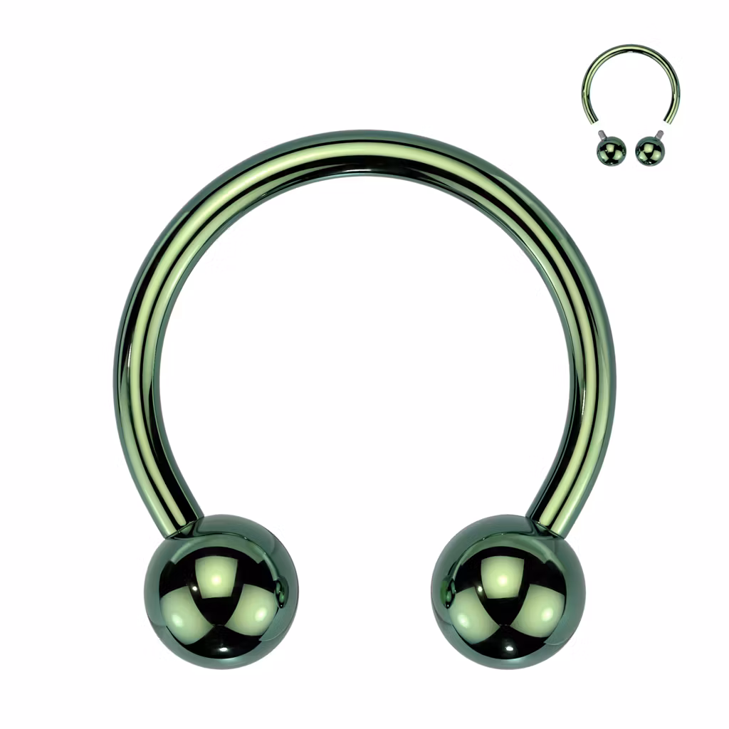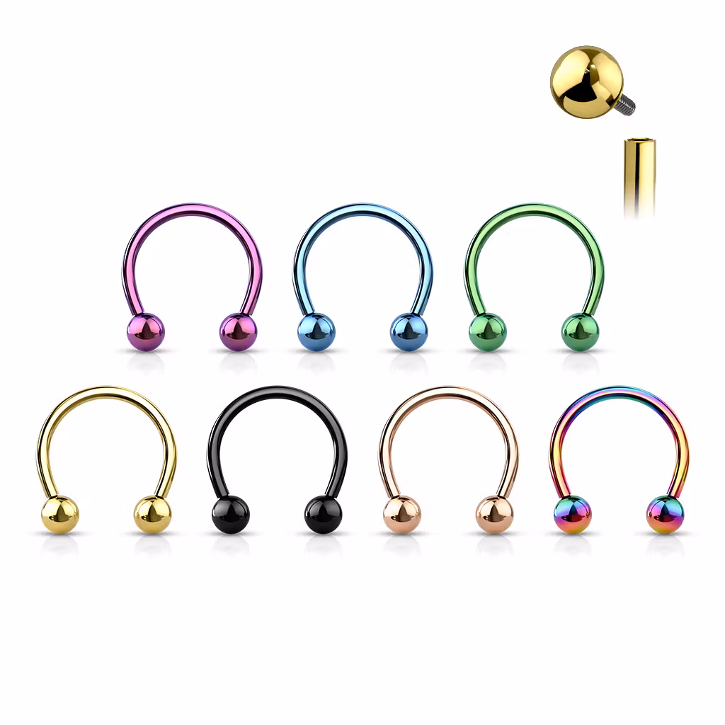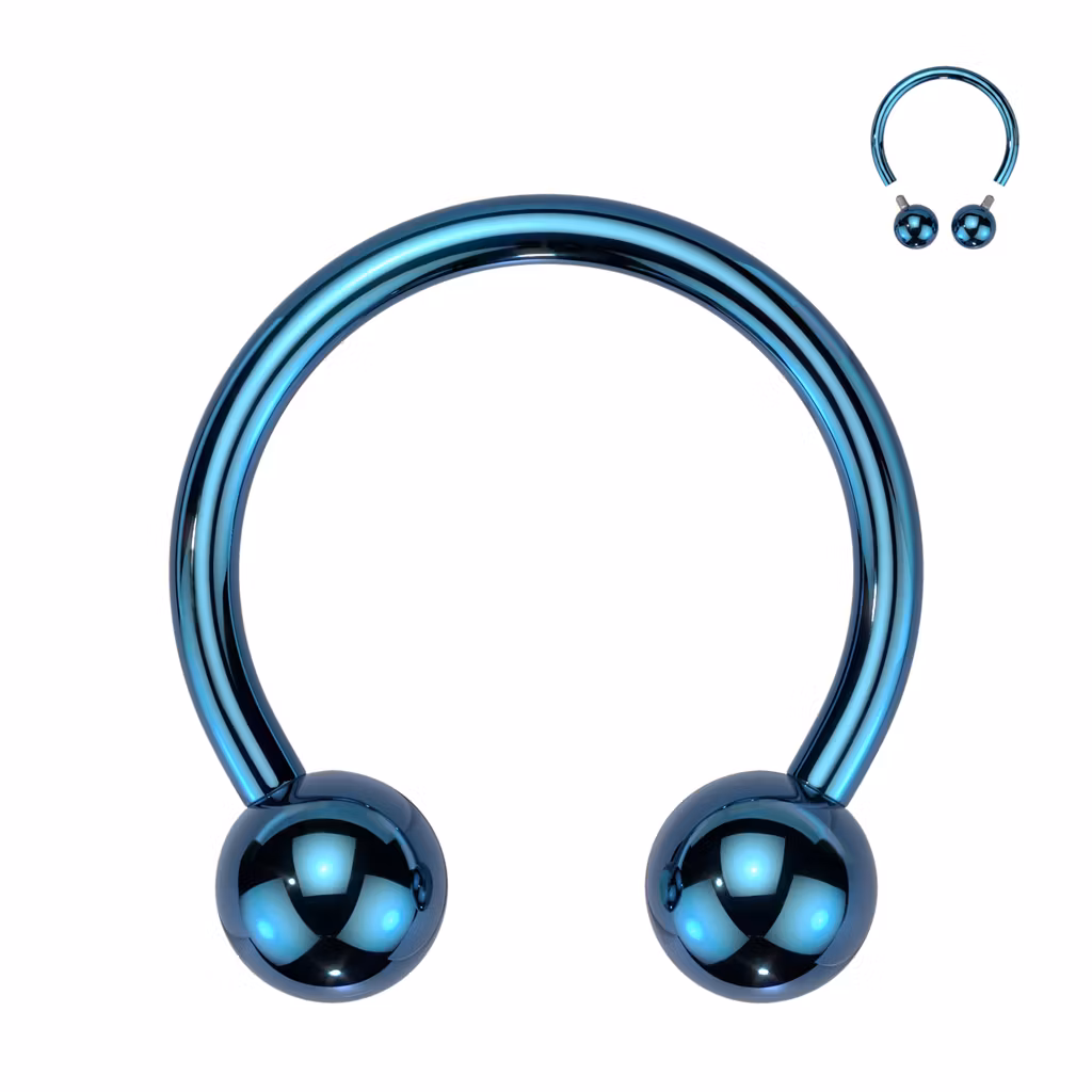 CBR / Hästsko / Cirkulär barbell i implantatsäker PVD-pläterad ASTM-F136 Grade 23 Titanium. Diameter anges som längd / innerdiameter. Invändigt gängad.