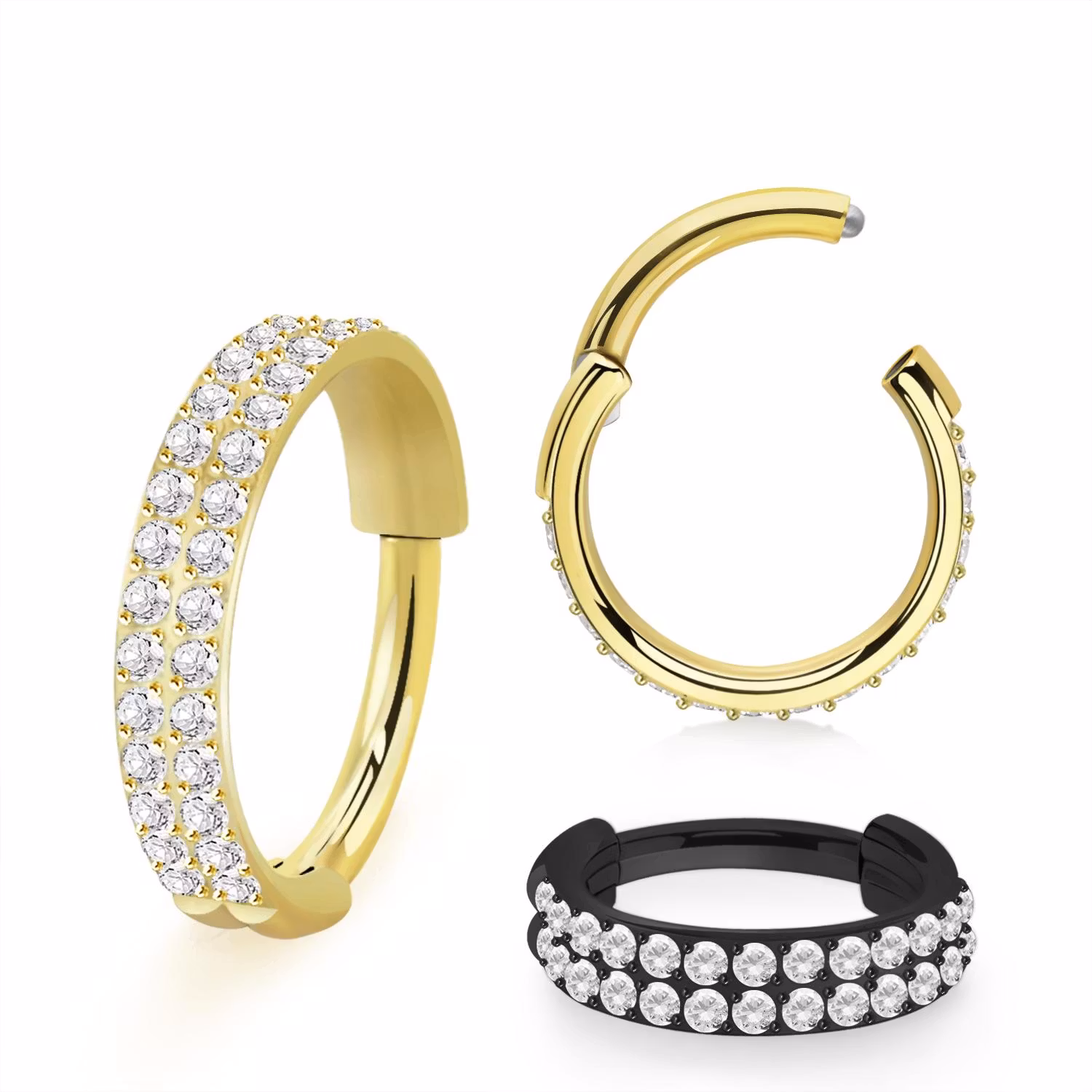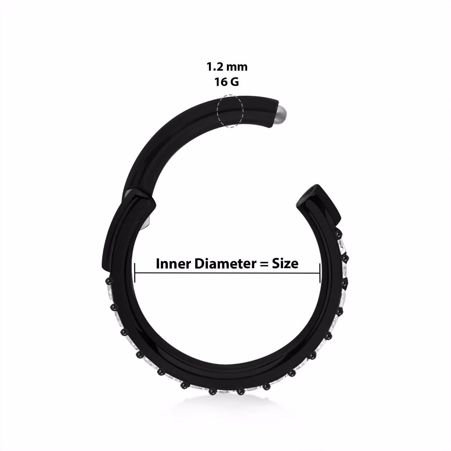 Clicker ring (öppningsbar med gångjärn) Helt tillverkad i implantatsäker PVD-pläterad ASTM-F136 Grade 23 Titanium. Kubisk zirconia av hög kvalité på ringens ytterkant. Diameter anges som ringens längd / innerdiameter. 16gauge - 1,2mm.
