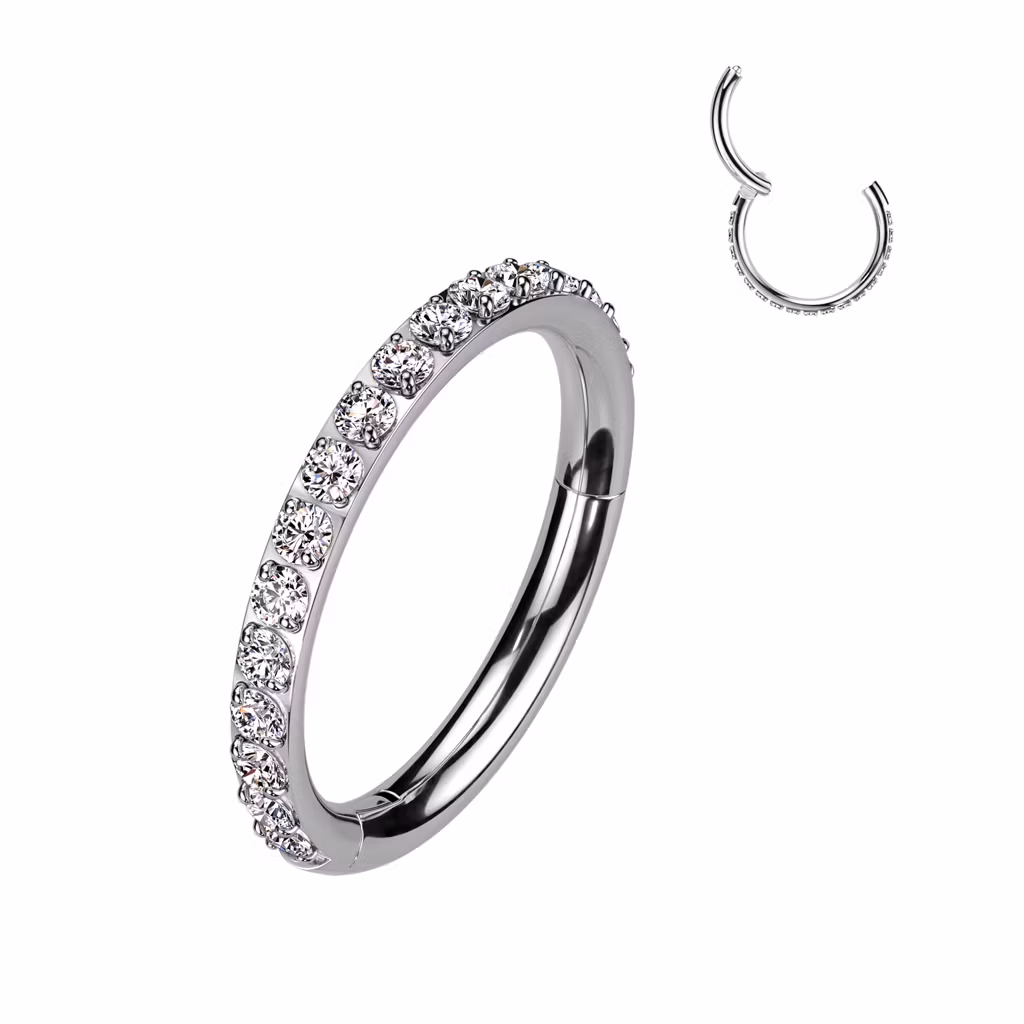 Clicker ring tillverkad helt i implantatsäker ASTM F-136 Grade 23 Titanium. Öppningsbar med gångjärn för enklare hantering. CNC-monterade klara kubisk zirconia på ringens ytterkant. 16gauge - 1,2mm. Ringens innerdiameter är 12mm vilket gör att den bland annat passar conch och piercing i septum.