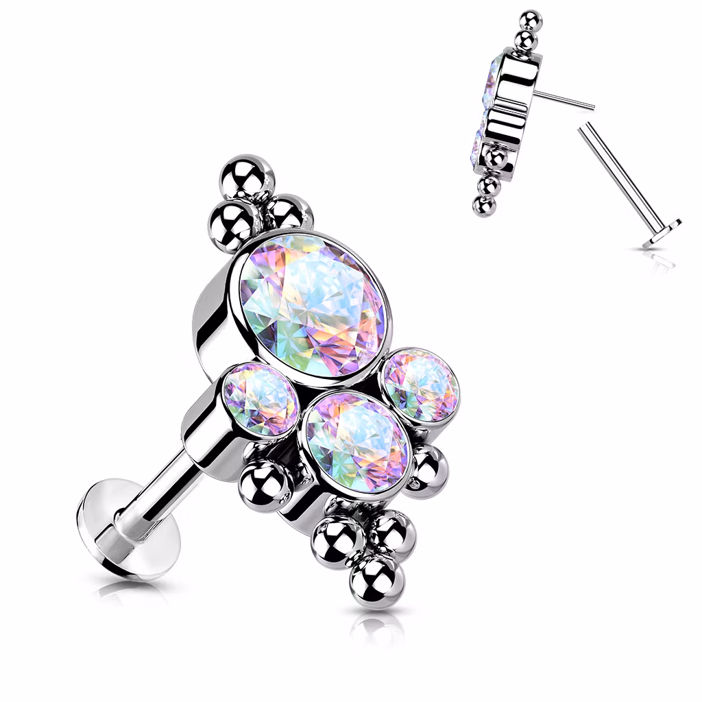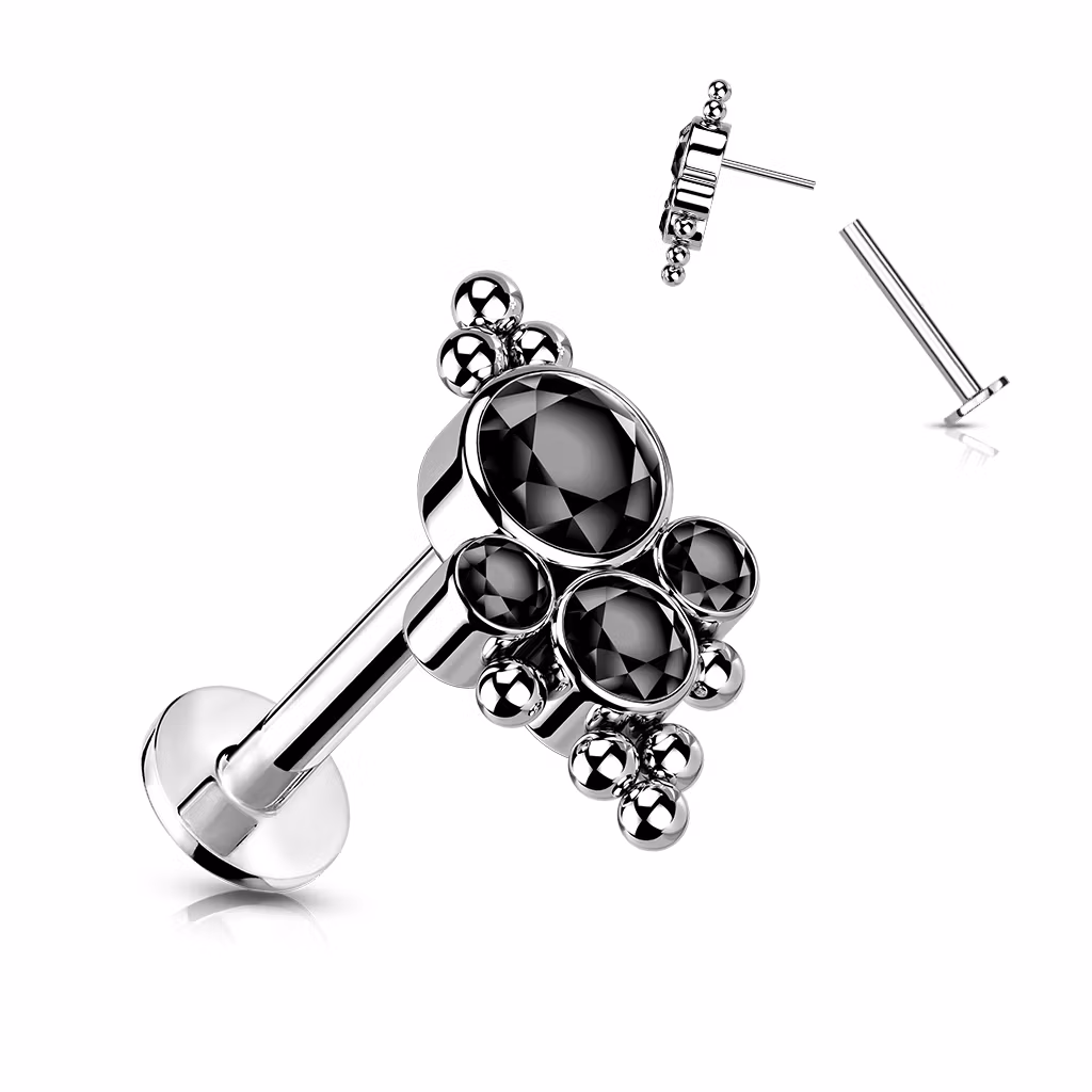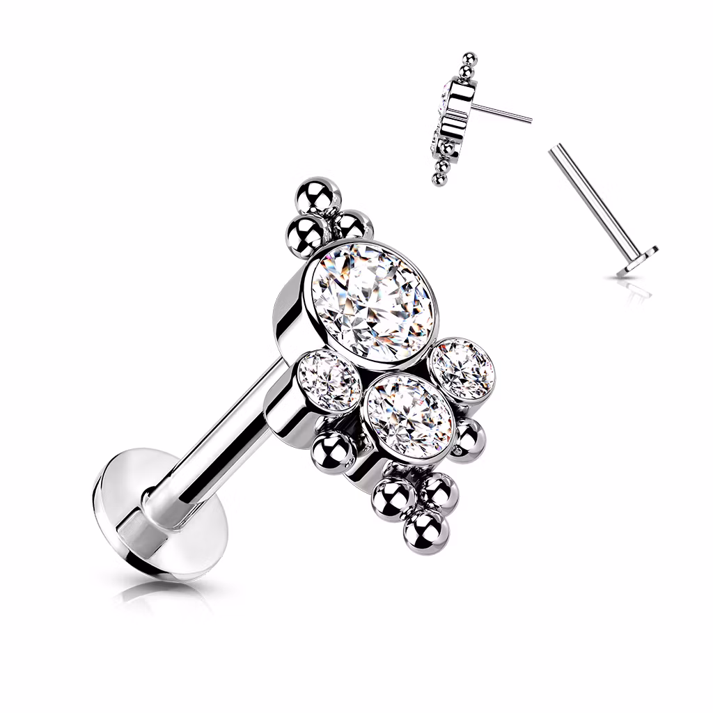 Labret / flat back 1,2mm i titanium treadless med bollkluster och kubisk zirconia