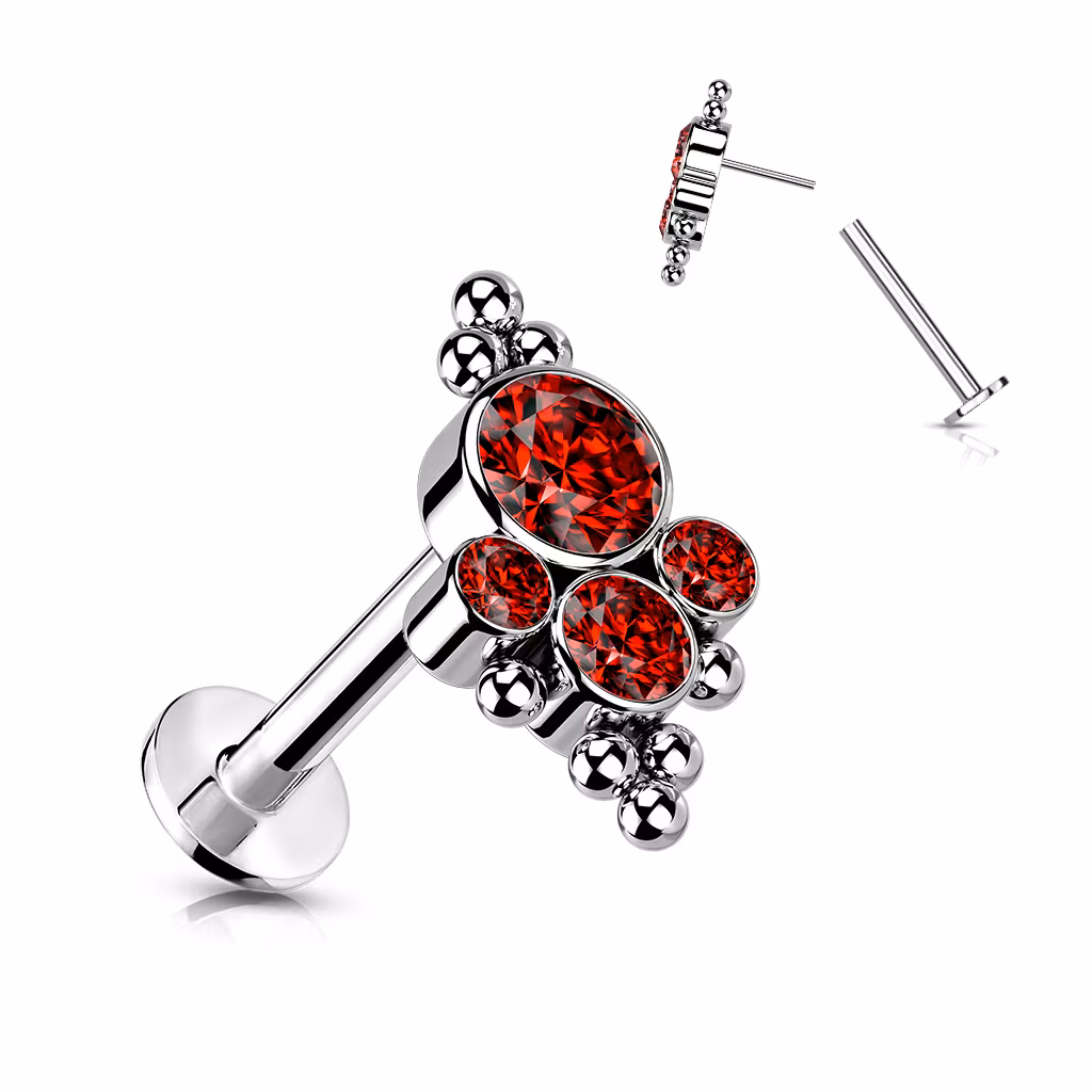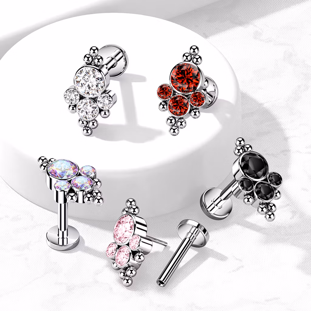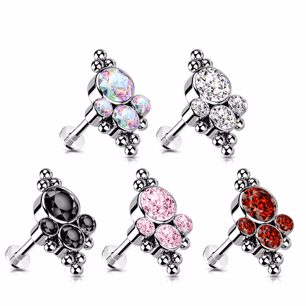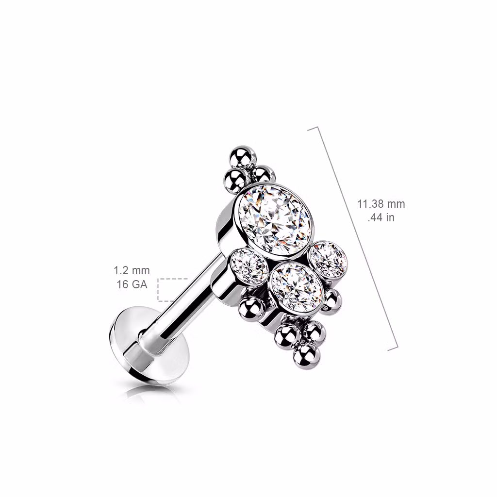 Labret / flat back 1,2mm i titanium treadless med bollkluster och kubisk zirconia