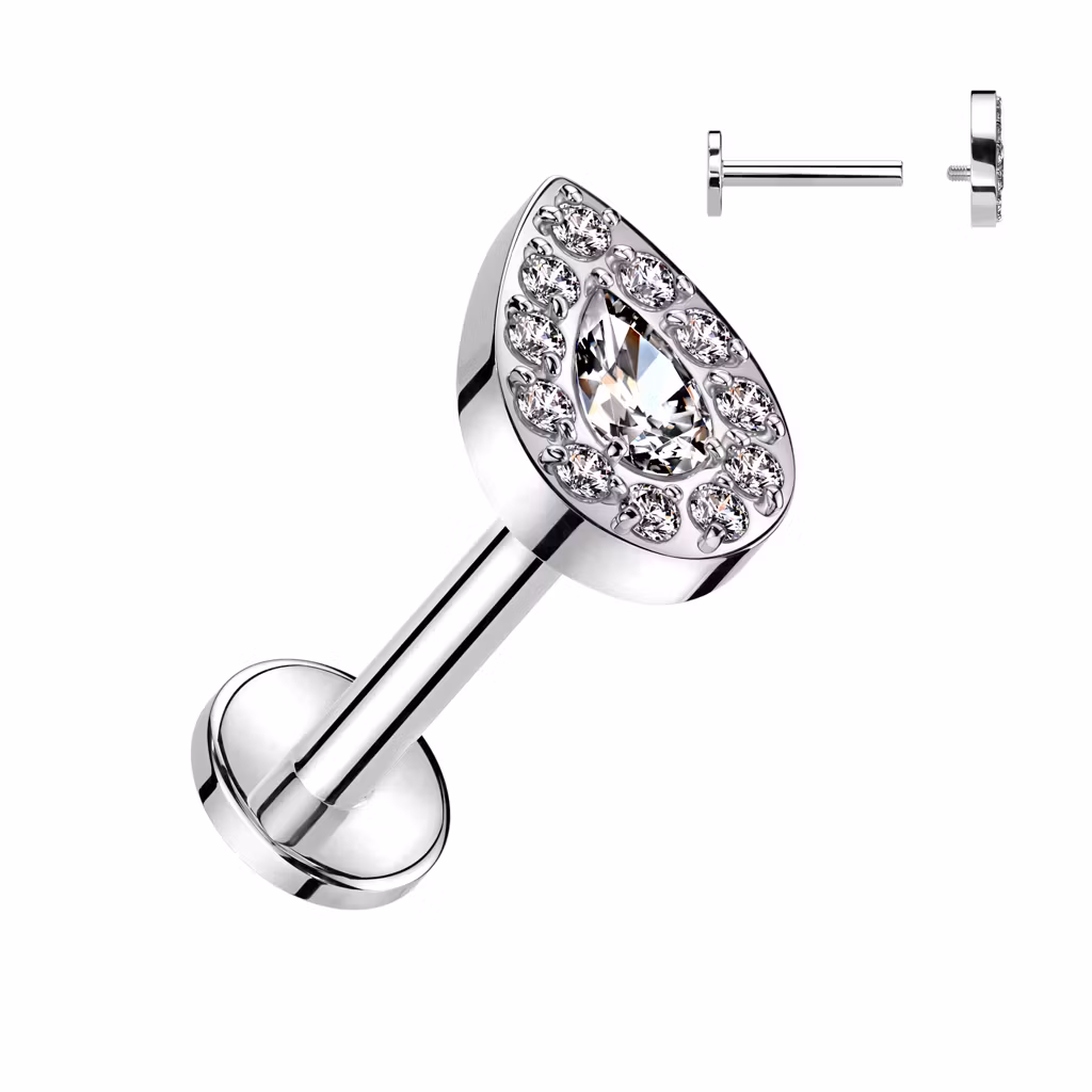 Labret / flat back piercing i titanium 1,2mm - Droppe med kubisk zirconia