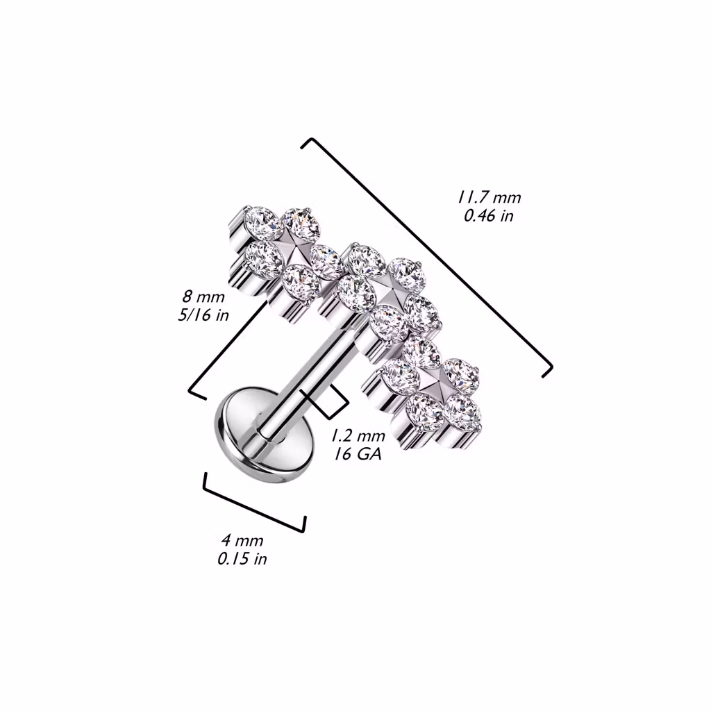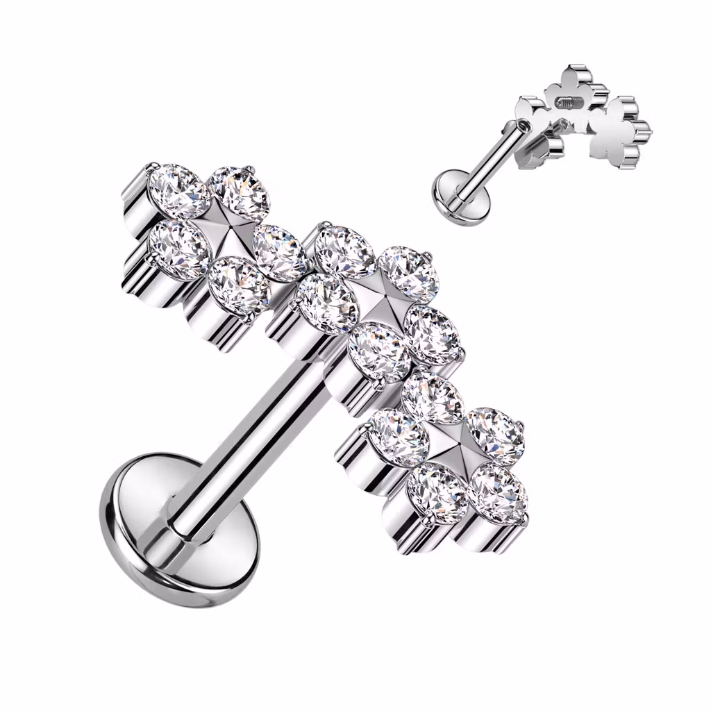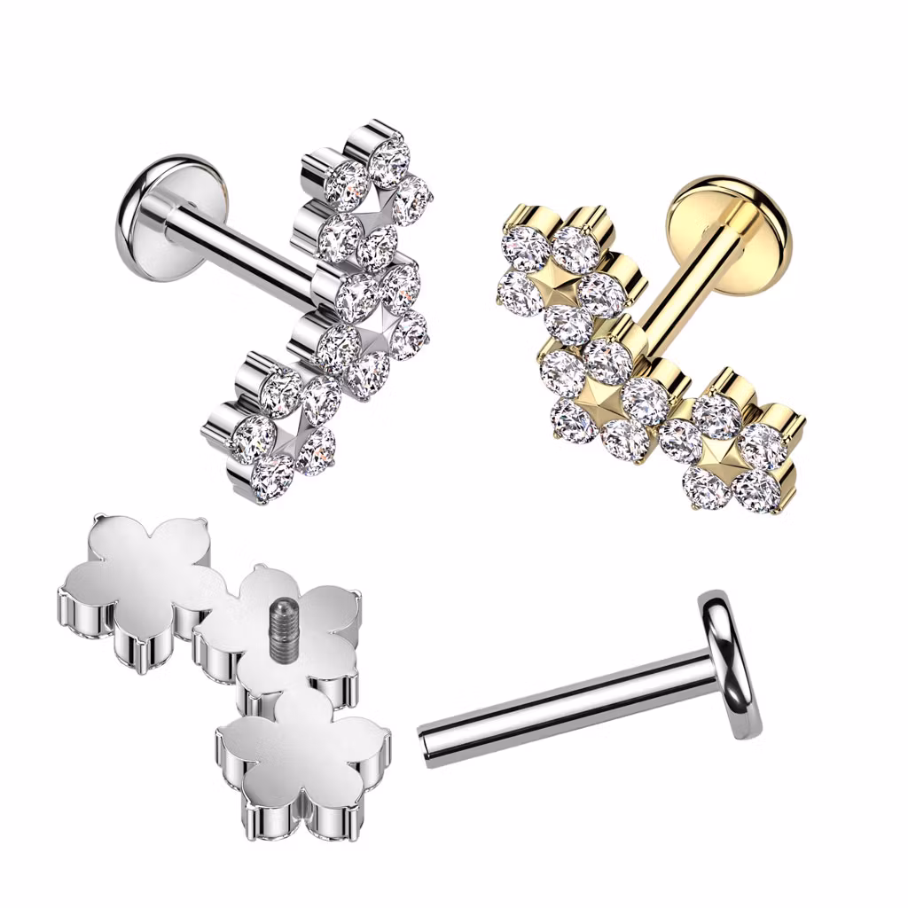 Labret / flat back piercing i titanium 1,2mm - Tre blommor med kubisk zirconia