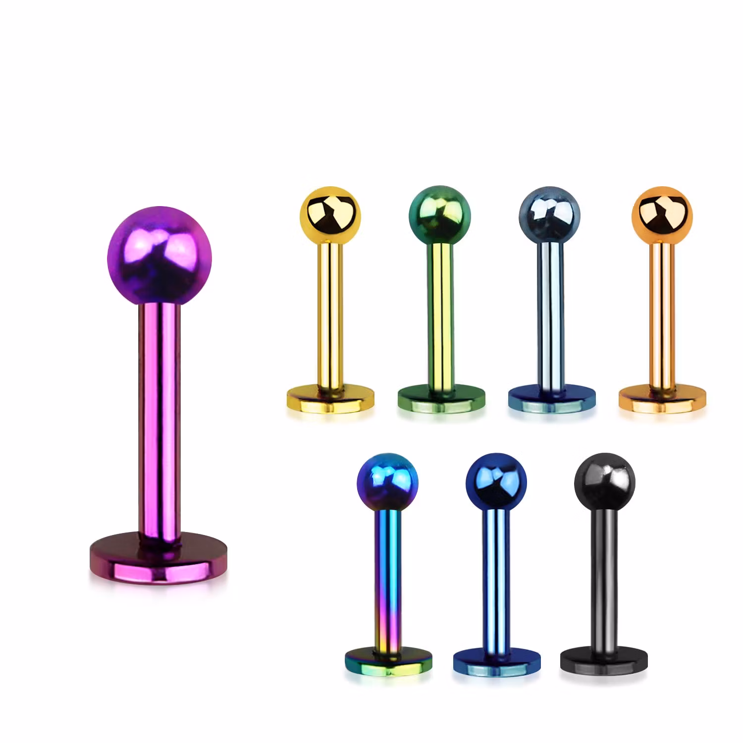 Labret i elektropläterad implantatsäker ASTM-F136 Grade 23 titanium. Utvändigt gängad labret 16gauge - 1,2mm med 3mm kula.