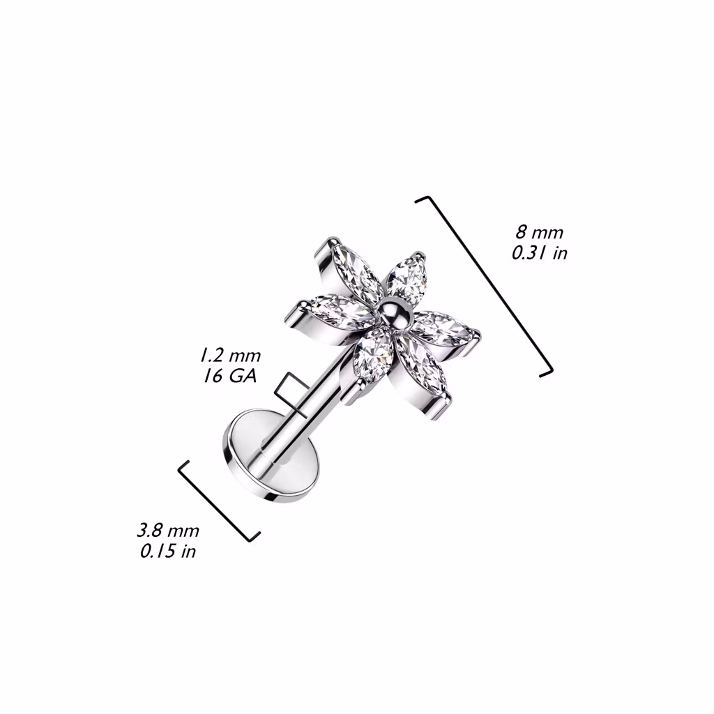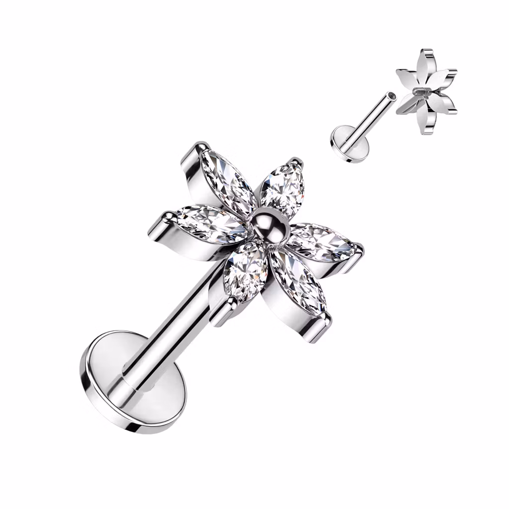 Labret / flat back piercing i titanium 1,2mm - Blomma med marquise kubisk zirconia