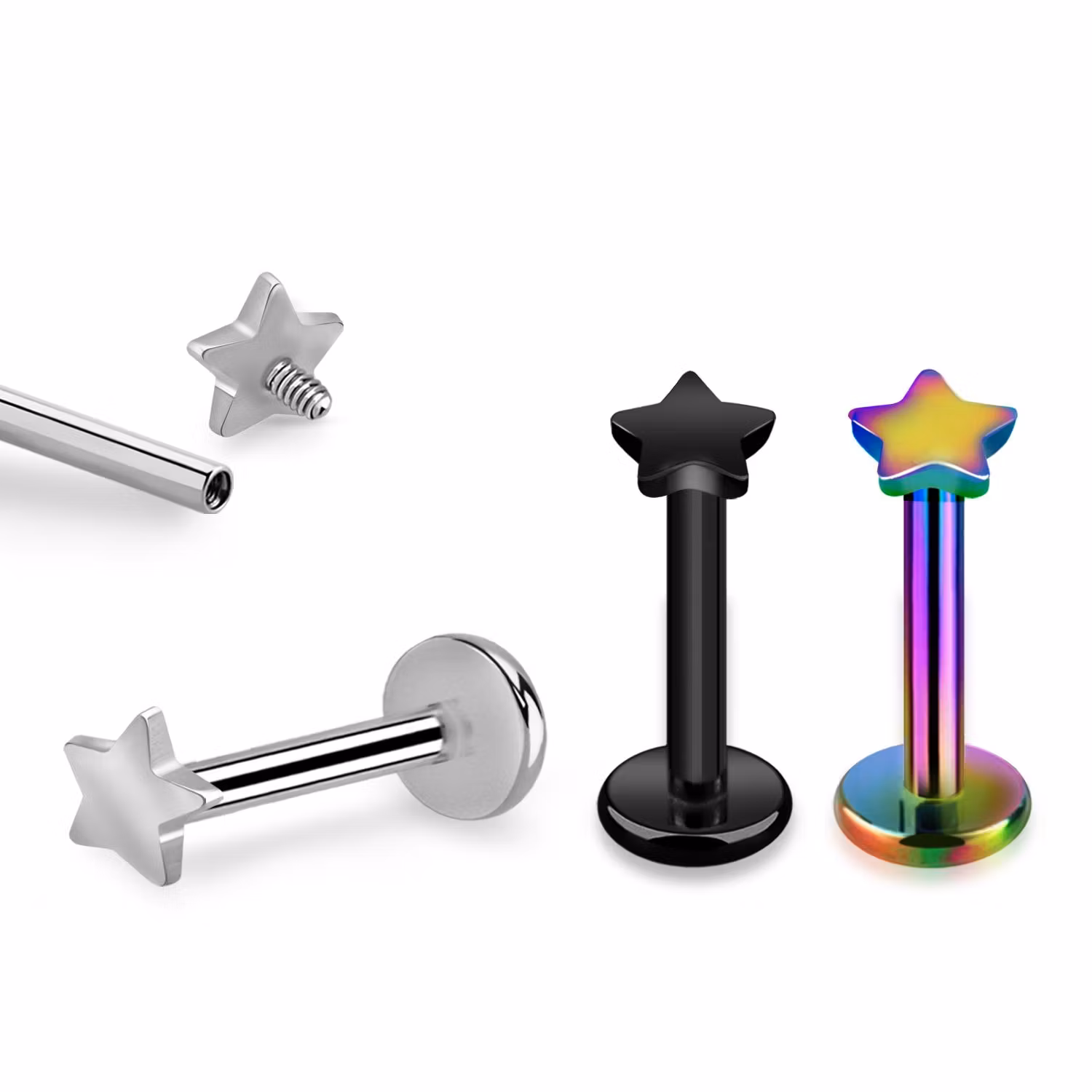 Labret helt i implantatsäker ASTM-F136 Grade 23 Titanium. 16gauge - 1,2mm. Invändigt gängad 0,9mm med 3mm stjärna. Högglanspolerad eller PVD-pläterade.