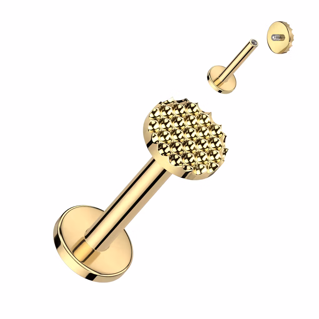 Labret / flat back piercing. Tillverkad helt i ASTM-F136 Grade 23 Titanium. Den guldfärgade är PVD-pläterad. 16gauge - 1,2mm. Invändigt gängad med 0,9mm gäng och 4mm bas.
