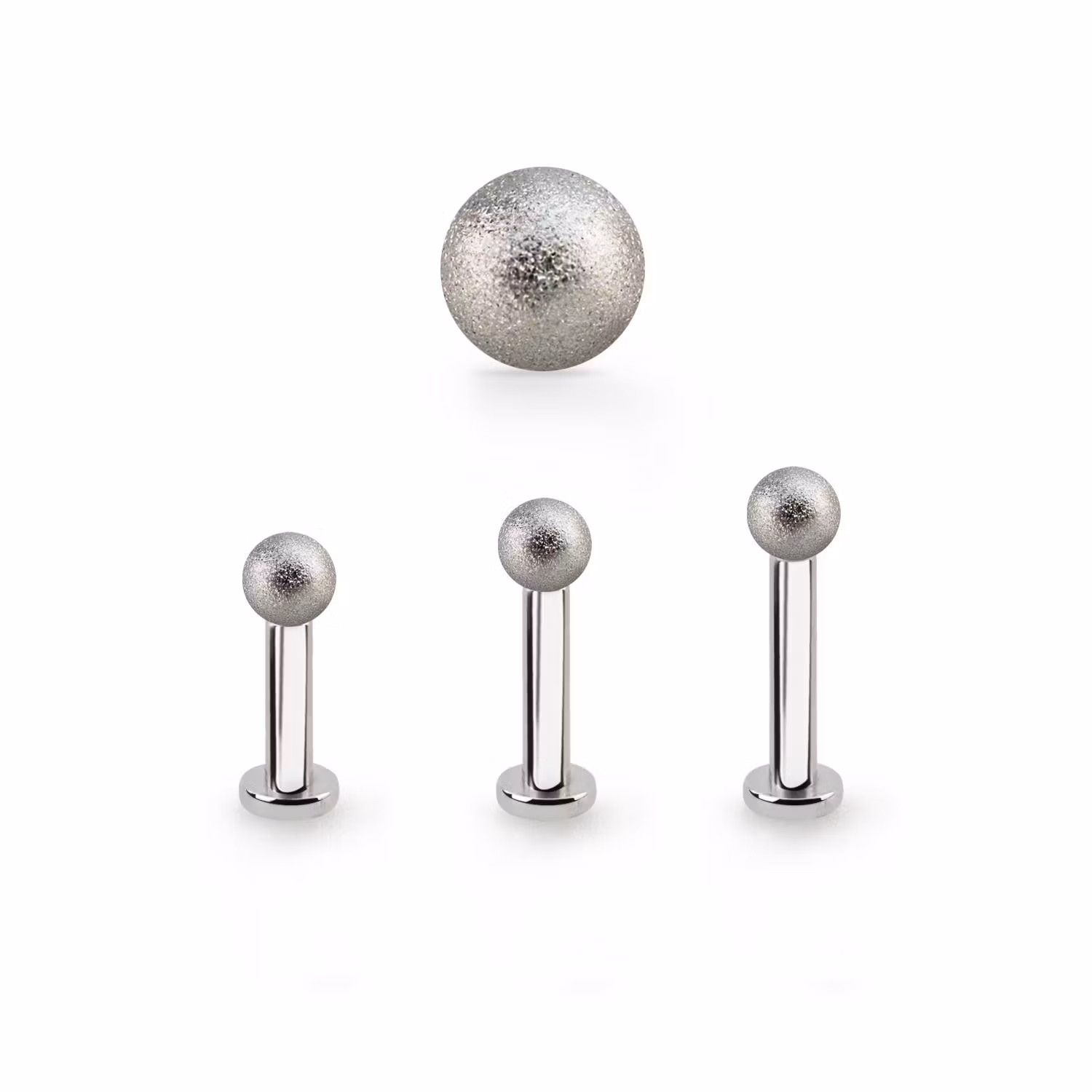 Labret i 316L kirurgiskt stål. 16gauge - 1.2mm. 3mm frostad kula. 2.5mm bas. Utvändigt gängad stav. Längden anges utan gängan och basen.