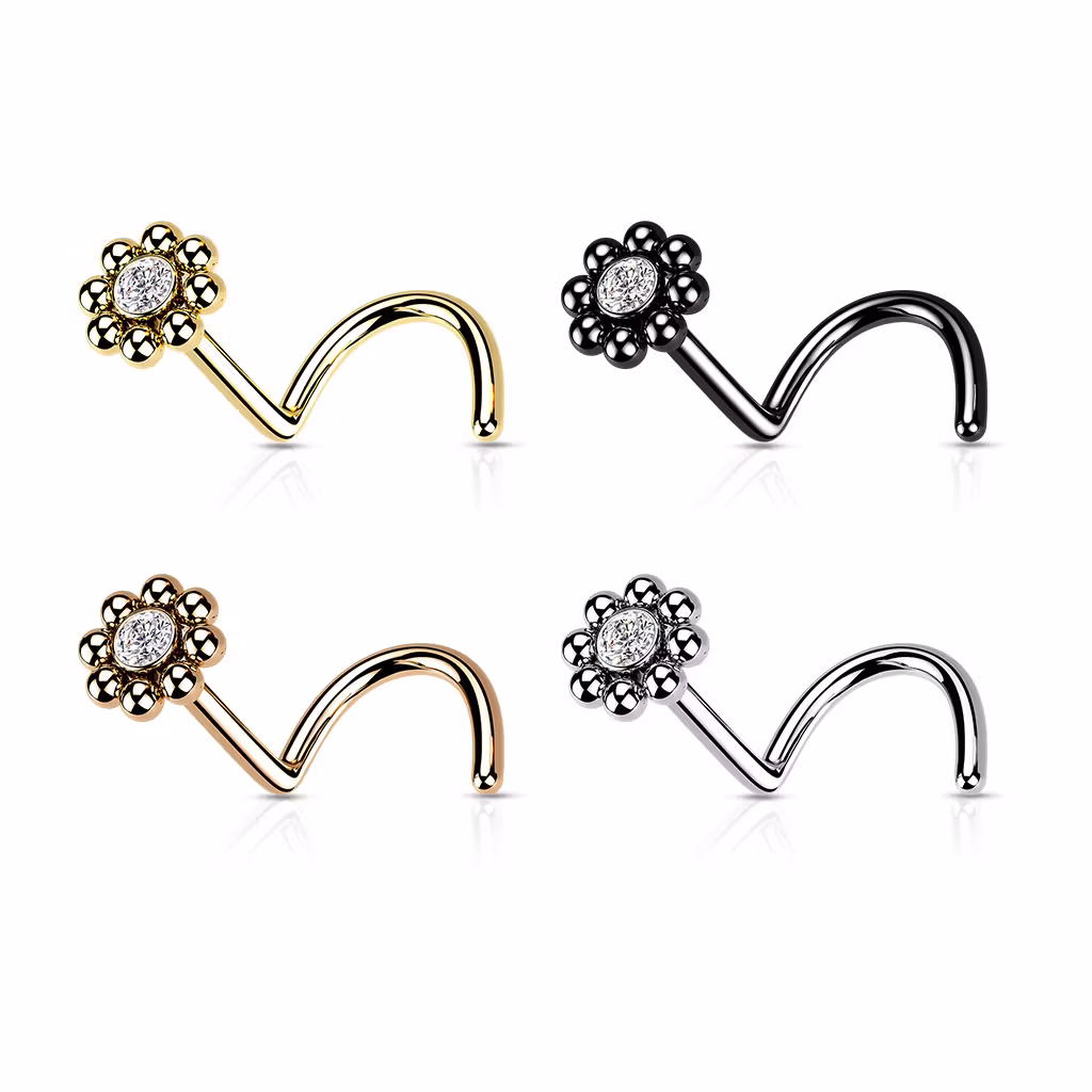 Nässmycke / Nässkruv i 316L kirurgiskt stål. De färgade är PVD-pläterade. Bollkluster / blommamed kubisk zirconia i mitten.