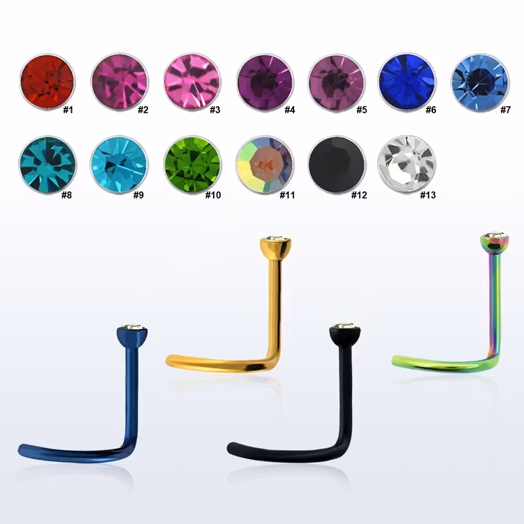 Nässkruv / näspiercing i PVD-pläterad 316L kirurgiskt stål 0,8mm med 2mm sten