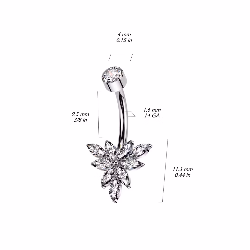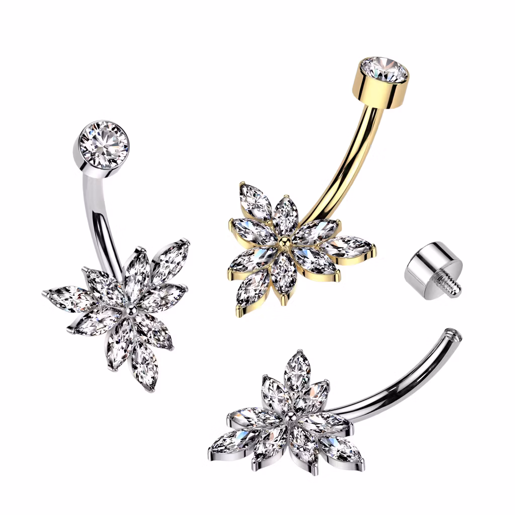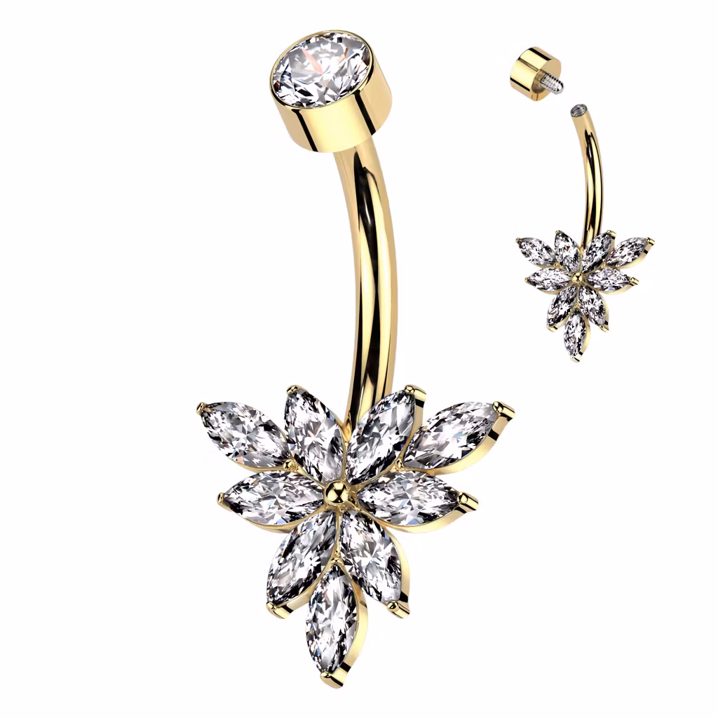 Navelsmycke helt tillverkad i implantatsäker ASTM-F136 Grade 23 Titanium. Blomma med marquisesnittslipade kubisk zirconia. 4mm cylinderformad kula i toppen. 10mm lång banana invändigt gängad och 14gauge - 1,6mm. Den guldfärgade är PVD-pläterad.