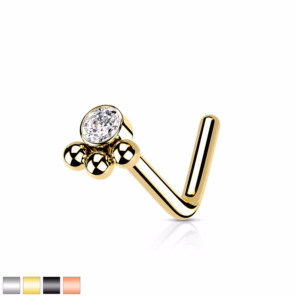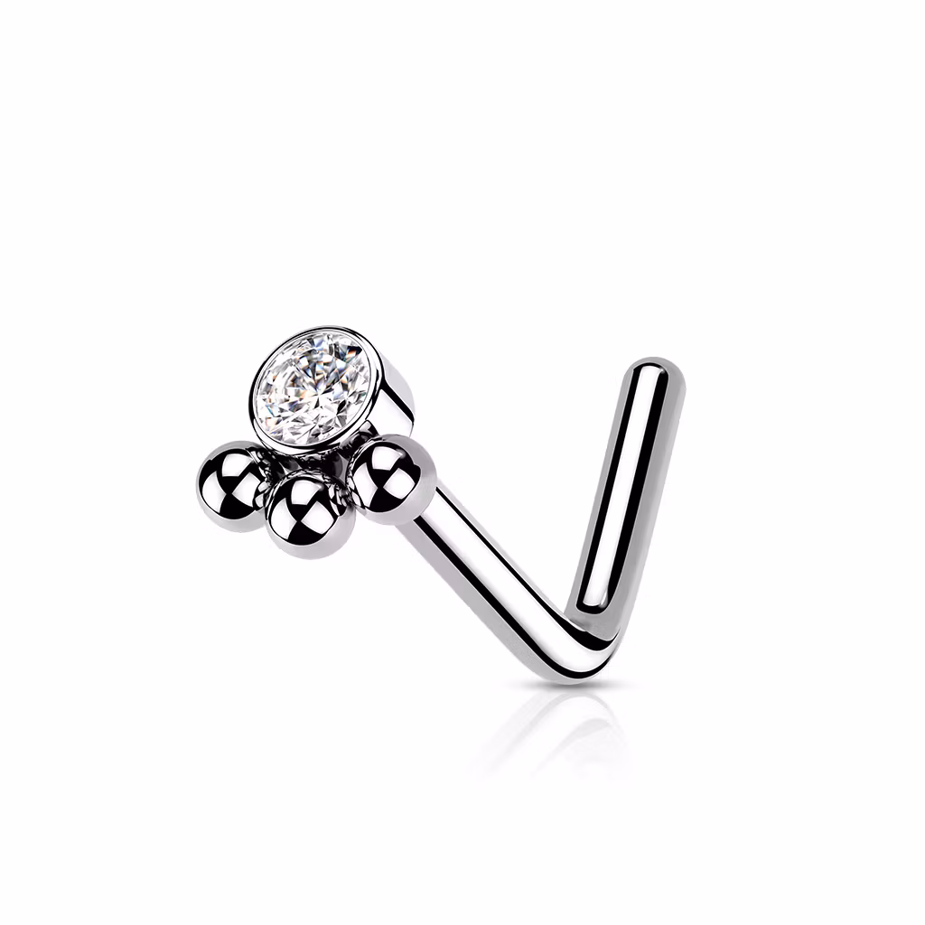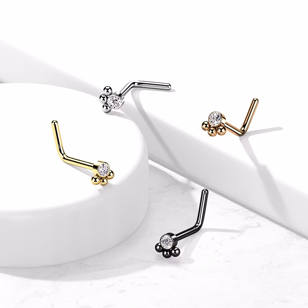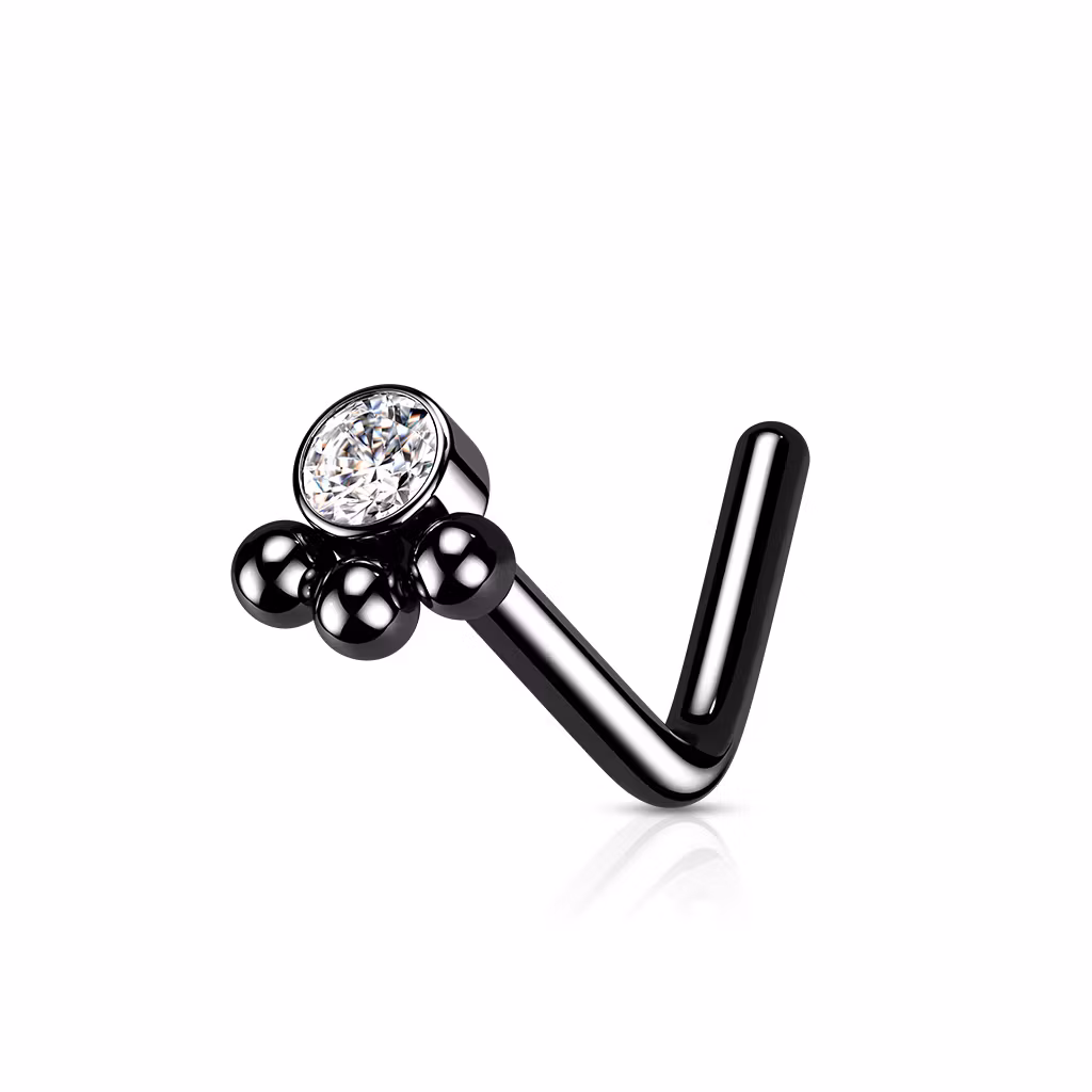 Näspiercing i 316L kirurgiskt stål. De färgade är PVD-pläterade. 20gauge - 0,8mm. Ca 6mm lång mellan toppen och L-böjen.