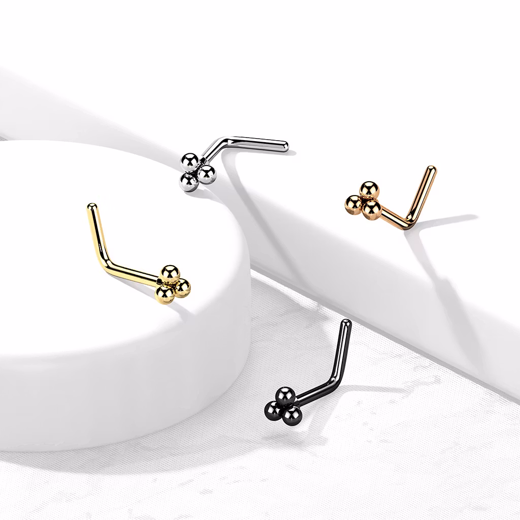 Näspiercing i 316L kirurgiskt stål. De färgade är PVD-pläterade. 20gauge - 0,8mm. 6mm lång mellan toppen och L-böjen.