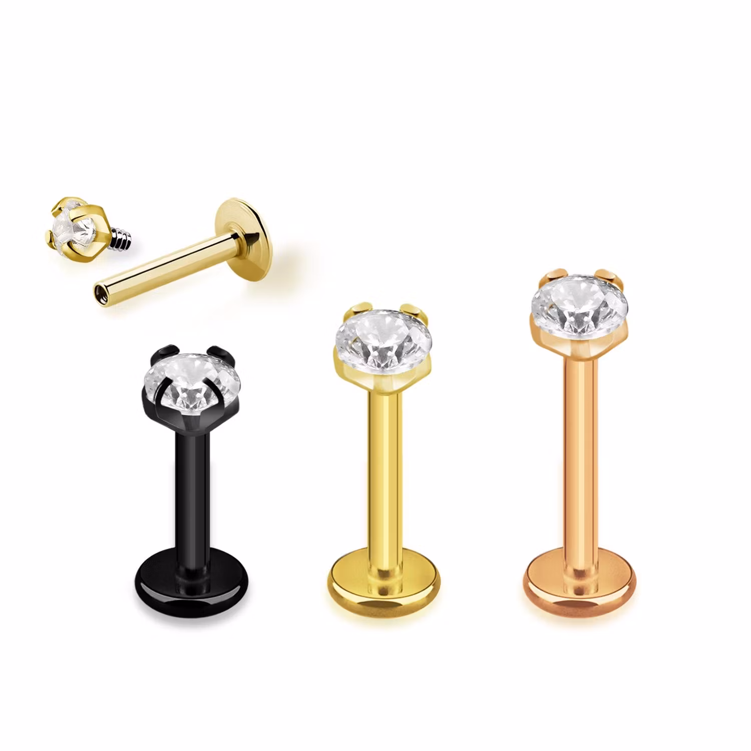 Labret / flat back piercing i PVD titanium - invändigt gängad 1,2mm prong-set 3mm kubisk zirconia