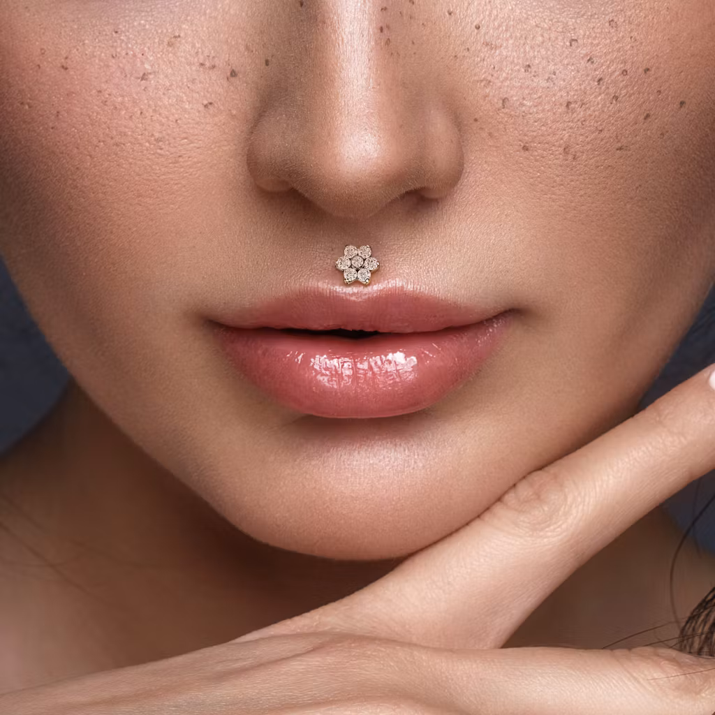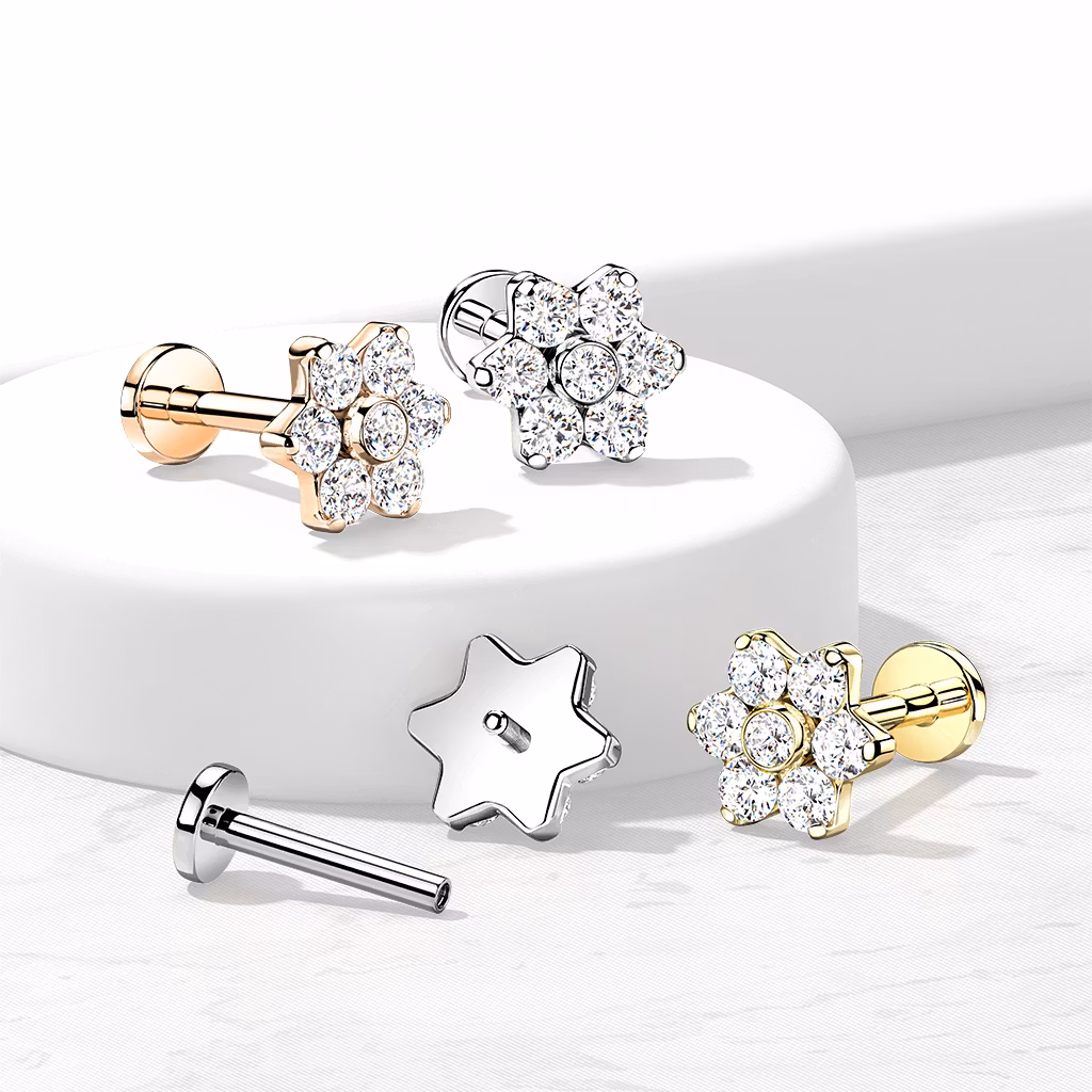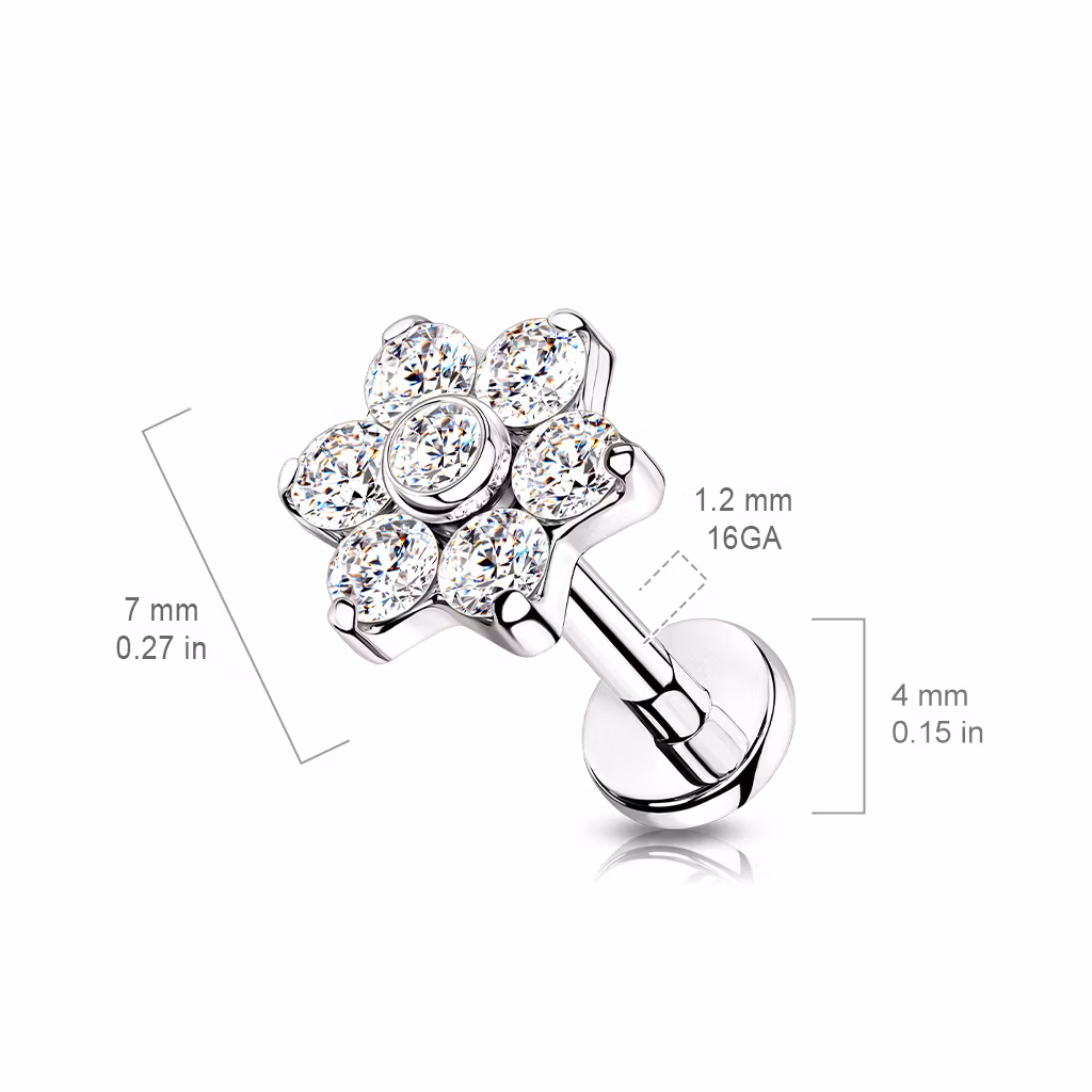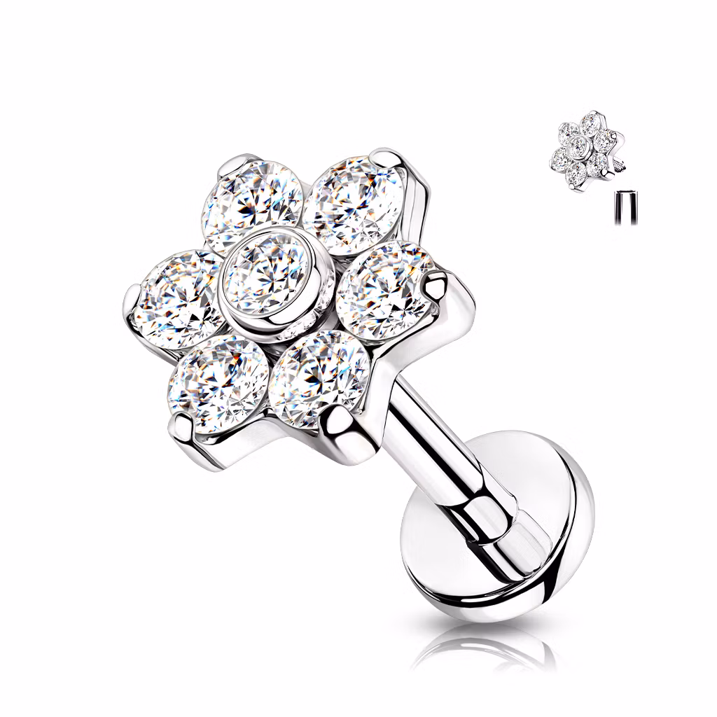 Labret / flat back piercing i titanium 1,2mm - Blomma med kubisk zirconia