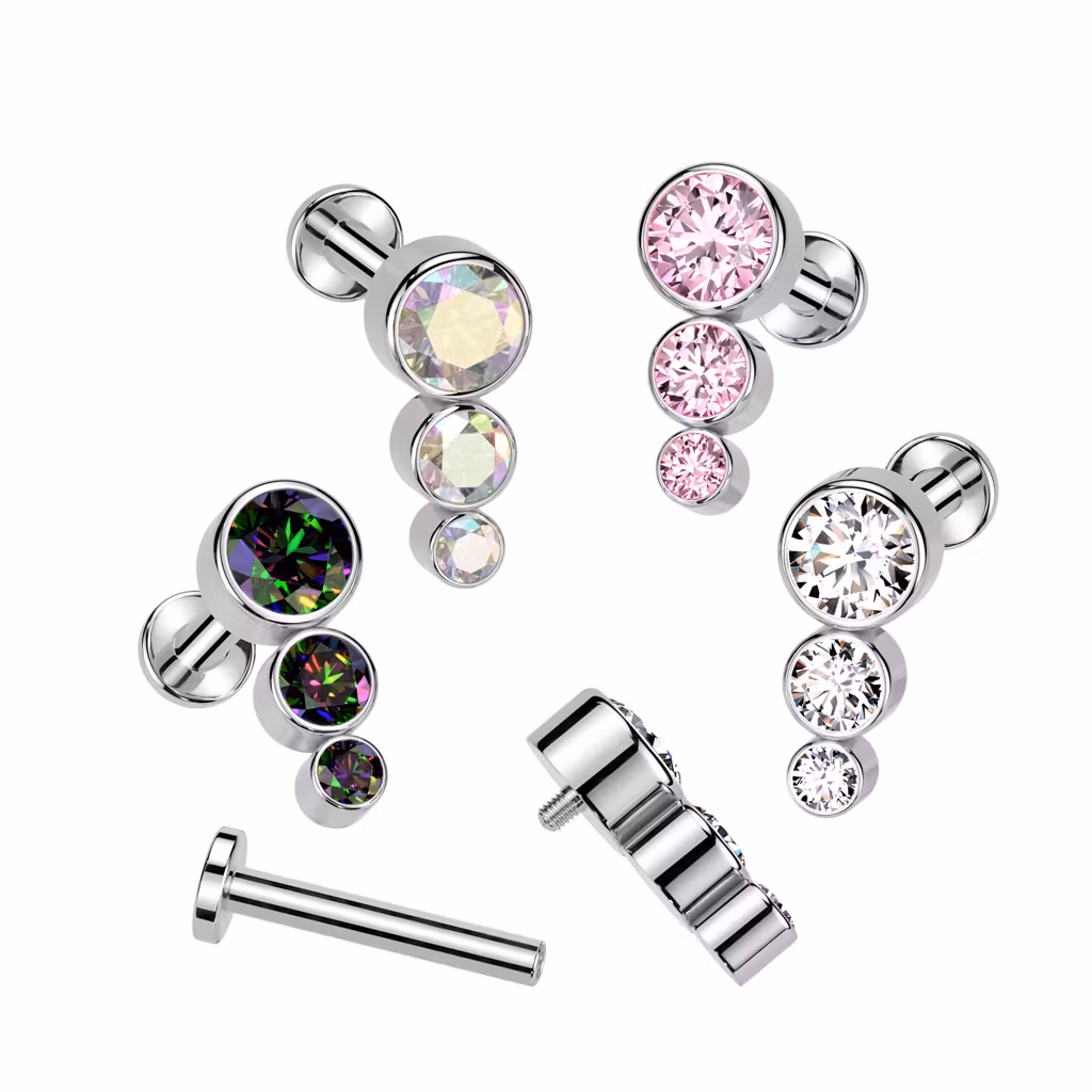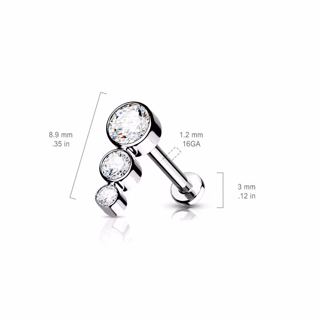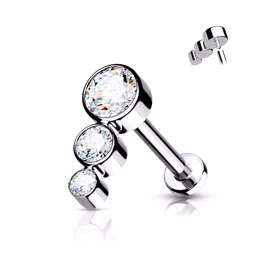 Labret / flat back piercing i titanium 1,2mm - Tre kubisk zirconia i ökande storlek