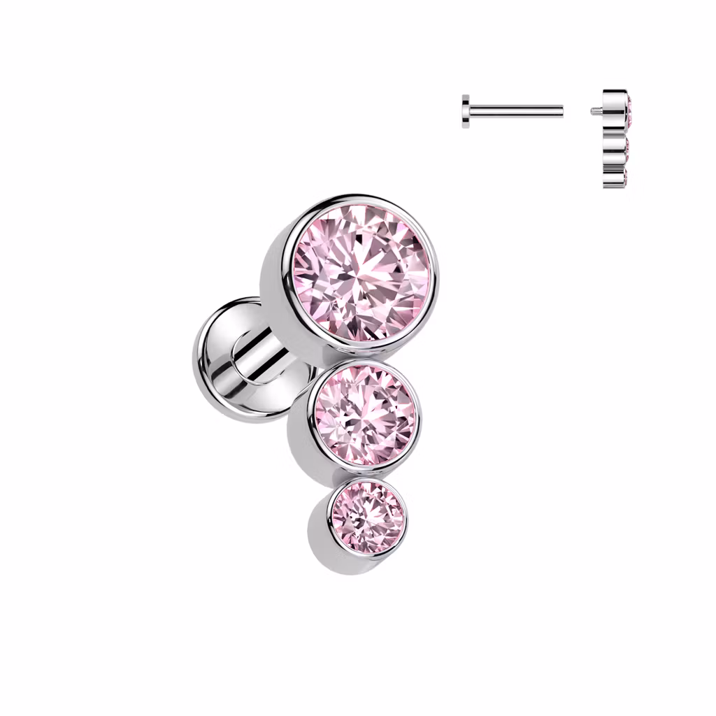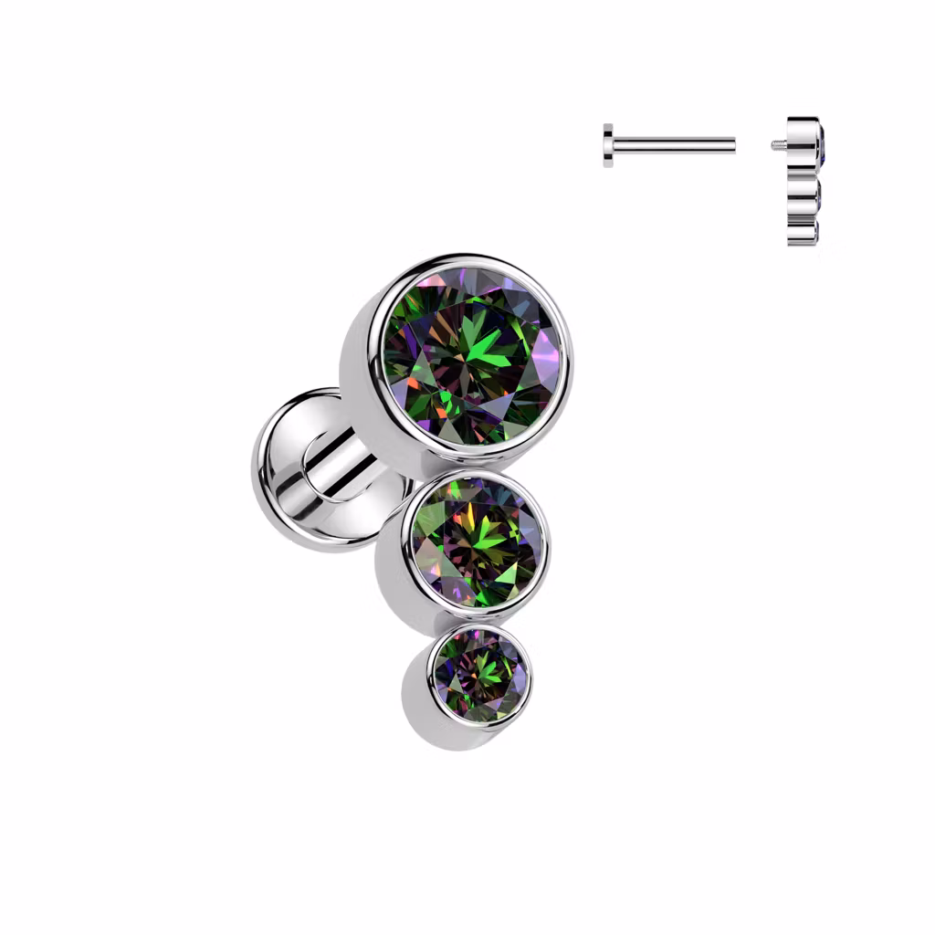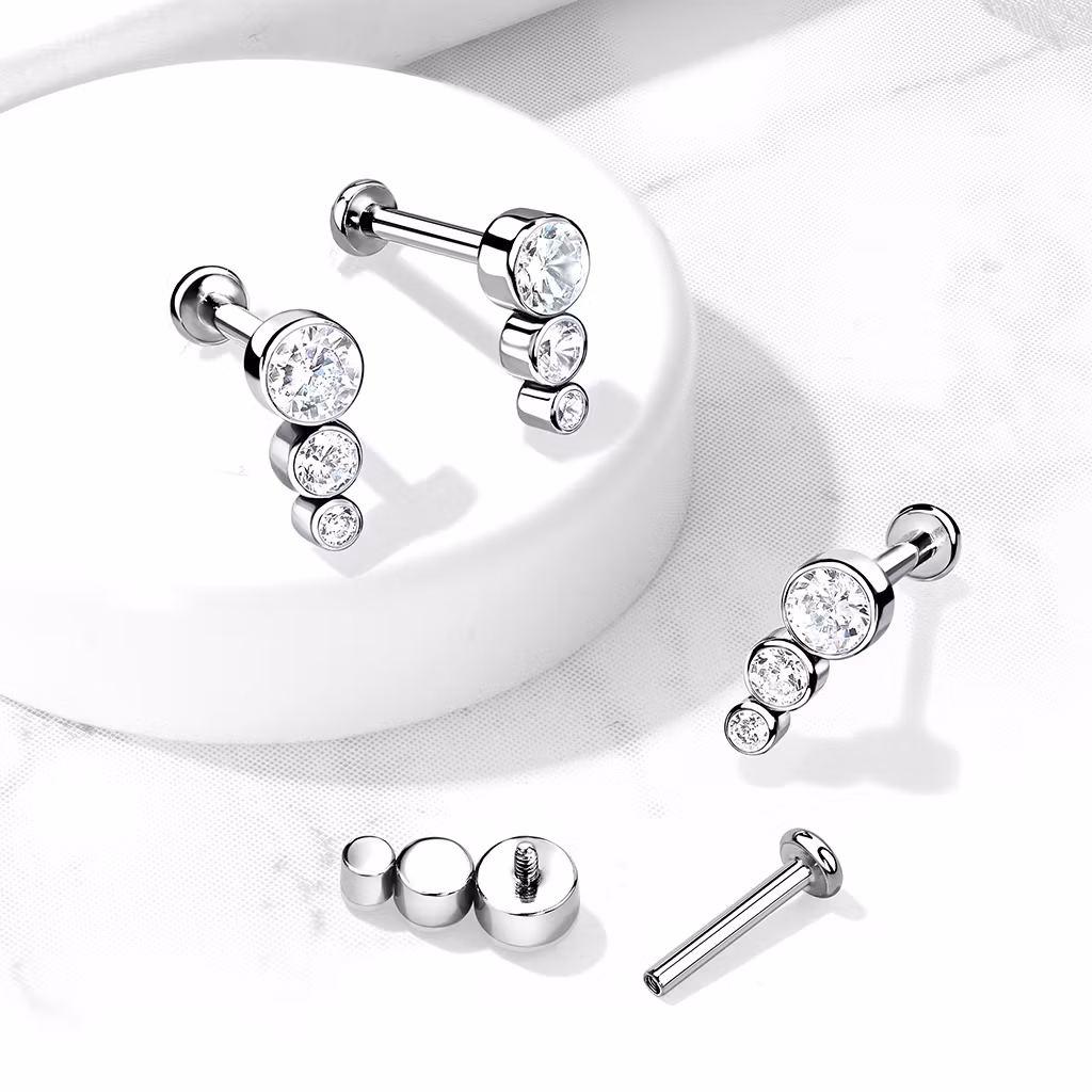 Labret / flat back piercing i titanium 1,2mm - Tre kubisk zirconia i ökande storlek