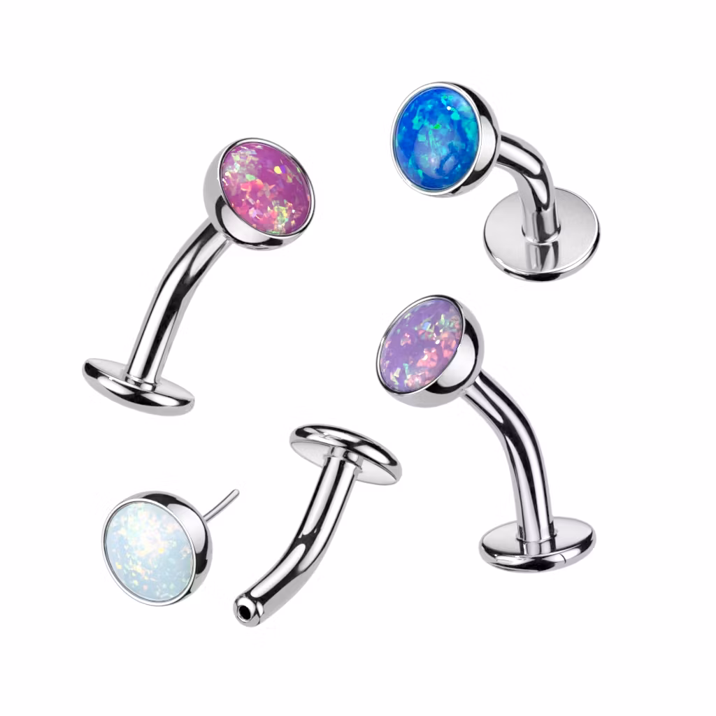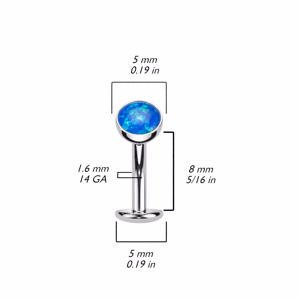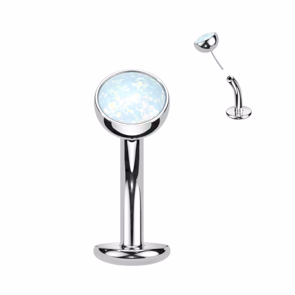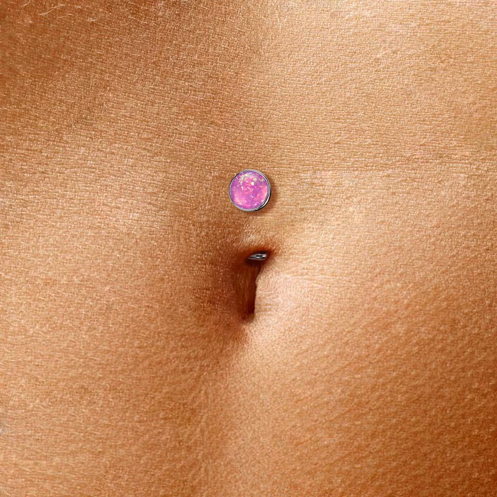 Navelsmycke "floating navel" med platt 5mm konvex botten och threadless topp med 5mm syntetisk opal.