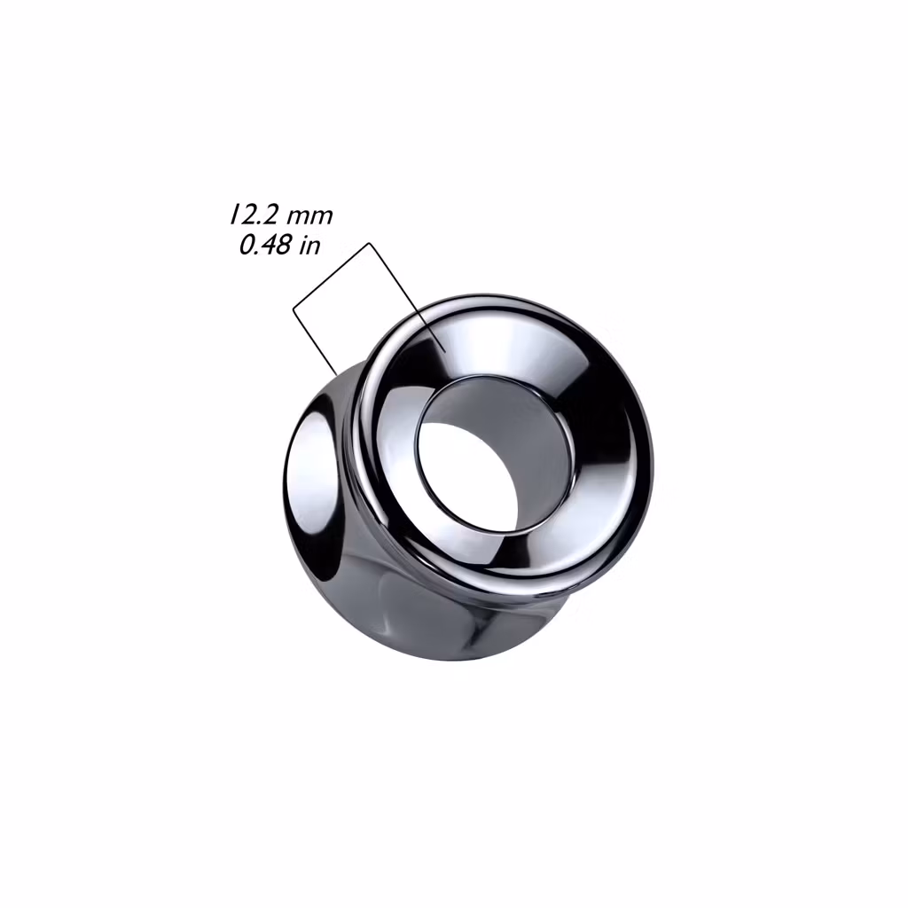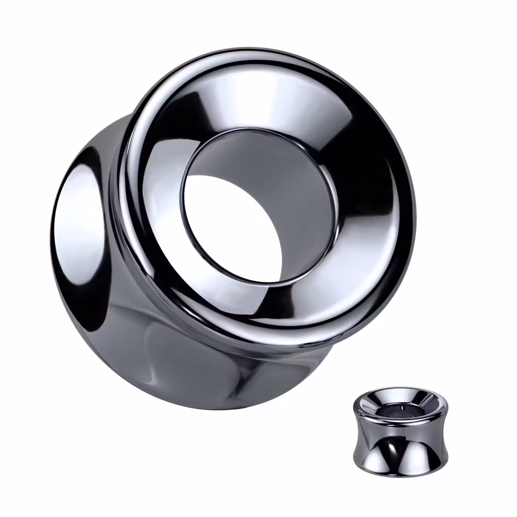 Double flare tunnel i hematit. Något upphöjd kant håller den på plats.
