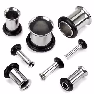 Tunnel / töjning i 316L kirurgiskt stål. Ena kanten är upphöjd och i den andra sitter en O-ring i gummi. Säljes styckevis.
