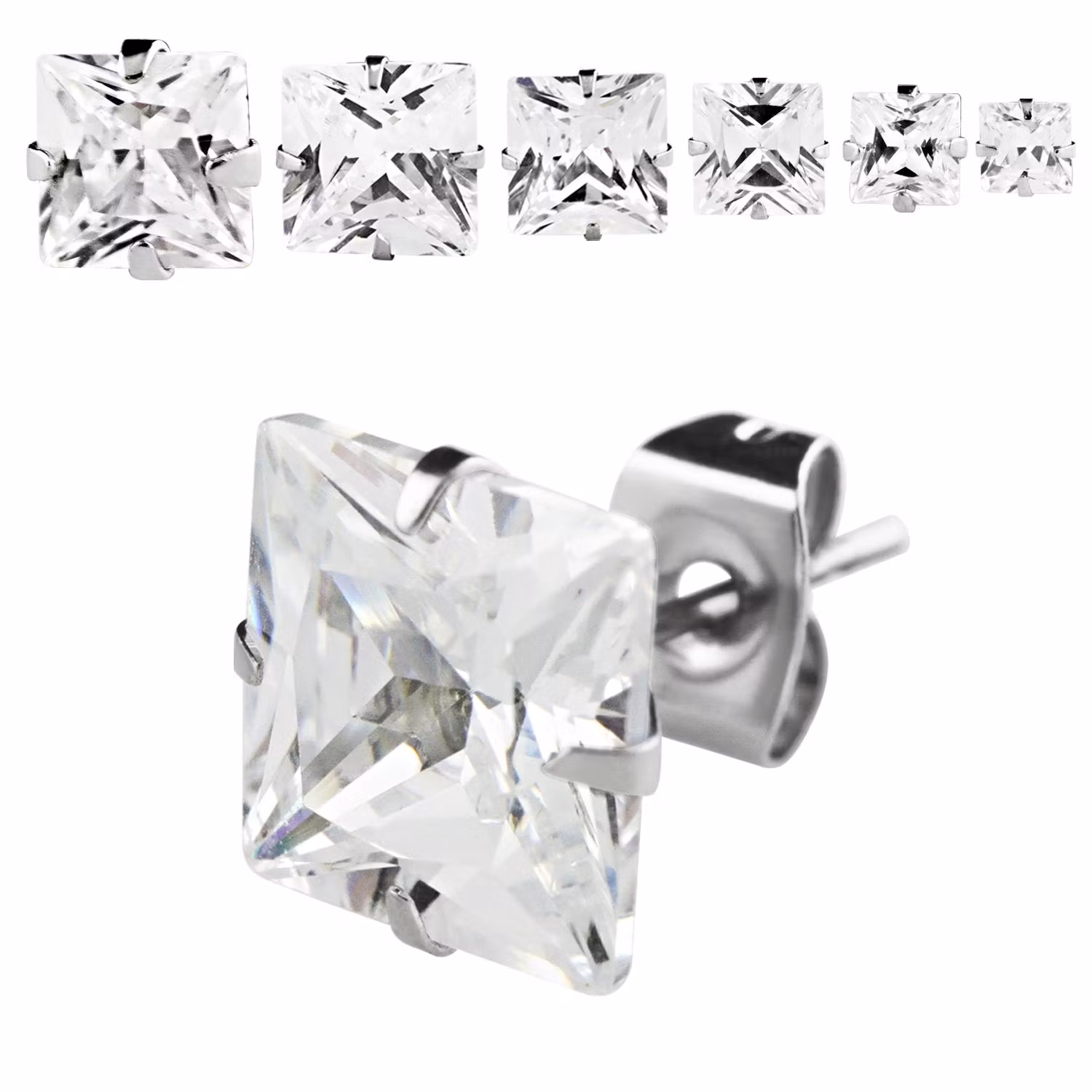Örhänge helt i 316L kirurgiskt stål. Fyrkantig kloinfattad klar kubisk zirconia.Passar vanligt öronhål och säljes i par.