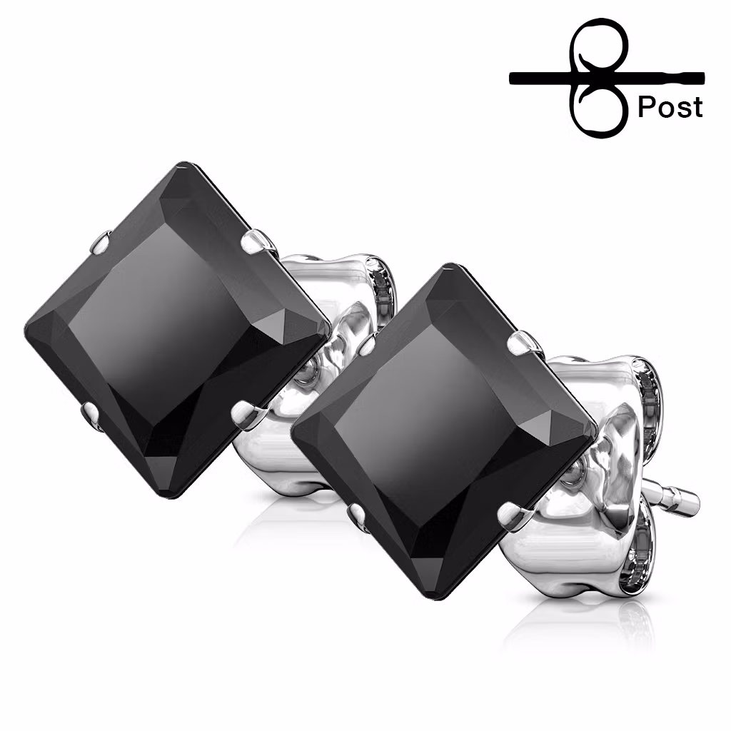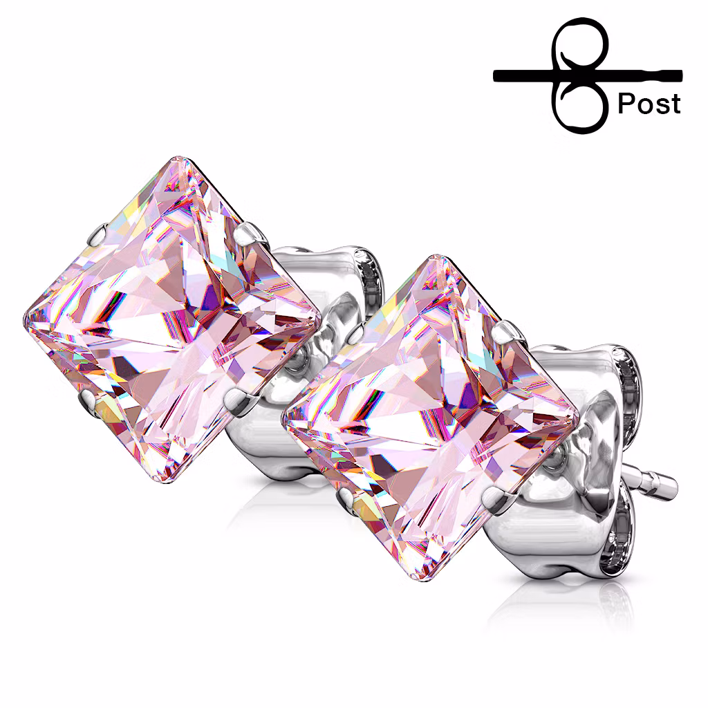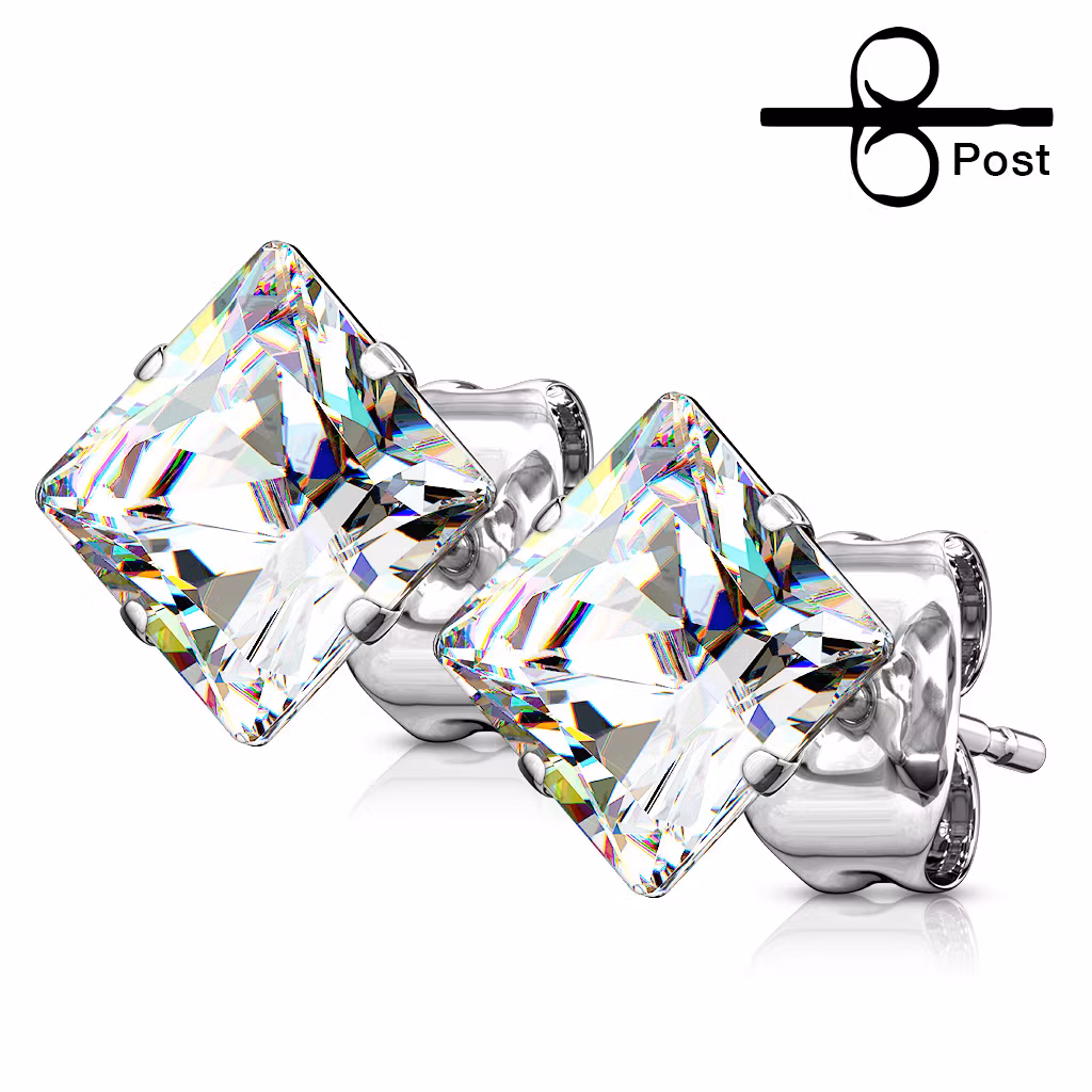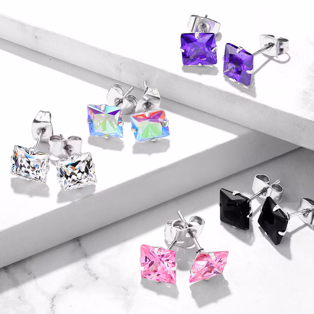 Öronpins i 316L Kirurgiskt stål. 20gauge - 0,8mm för öronhål.Fyrkantig prinsesslipad kubisk zirconia. Säljes i par.