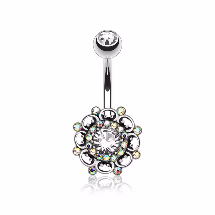 Liten rund blomma med stenar ca 13mm i diameter och tillverkad i pläterad 302L metall. 5mm kula med crystal i överkant.