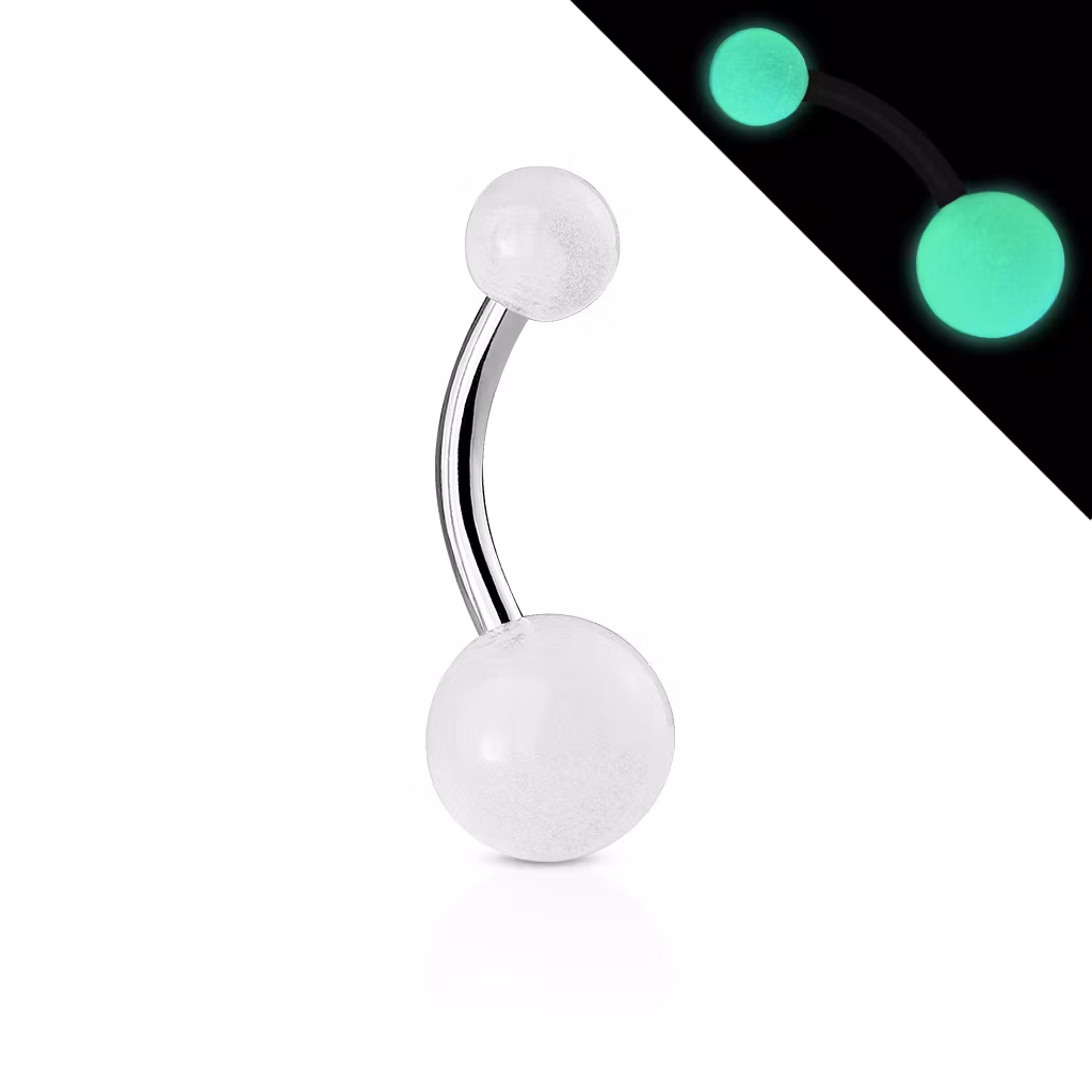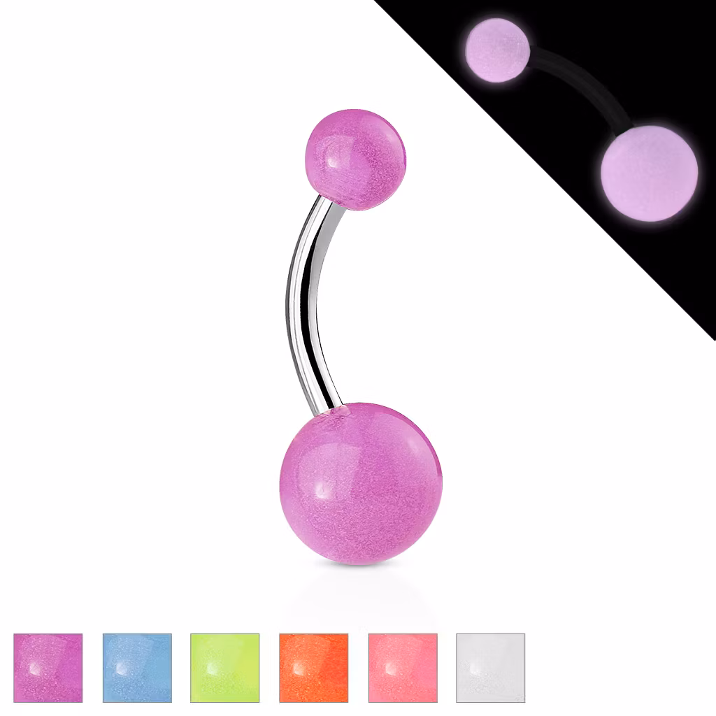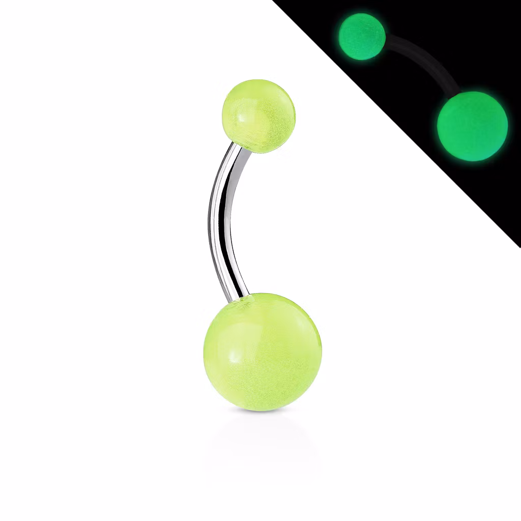 Navelsmycke med banana i 316L kirurgiskt stål. Akrylkulor 5mm och 8mm som lyser i mörkret. 10mm lång stav.