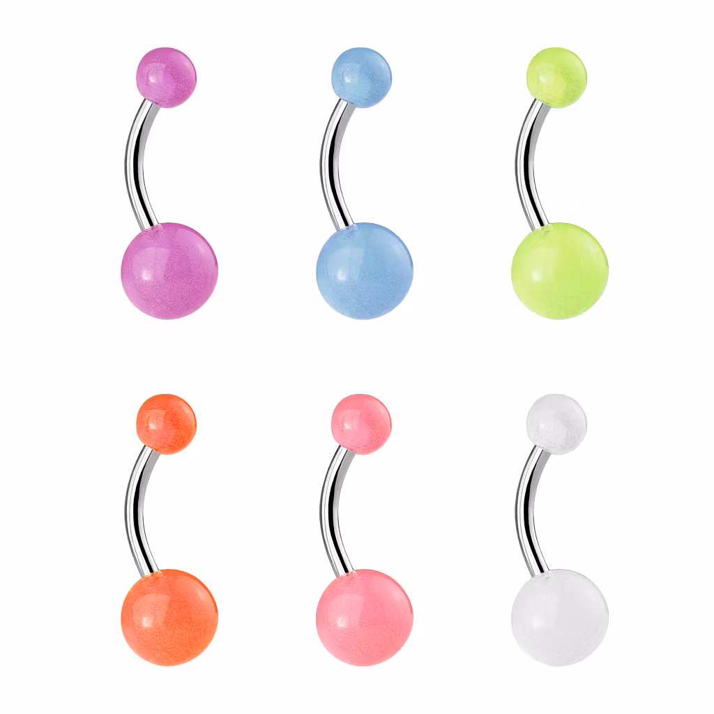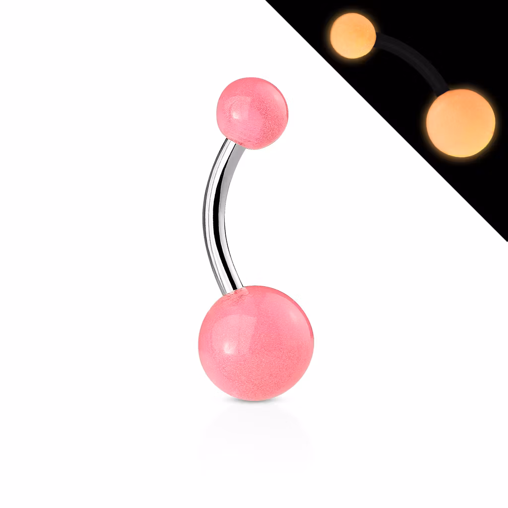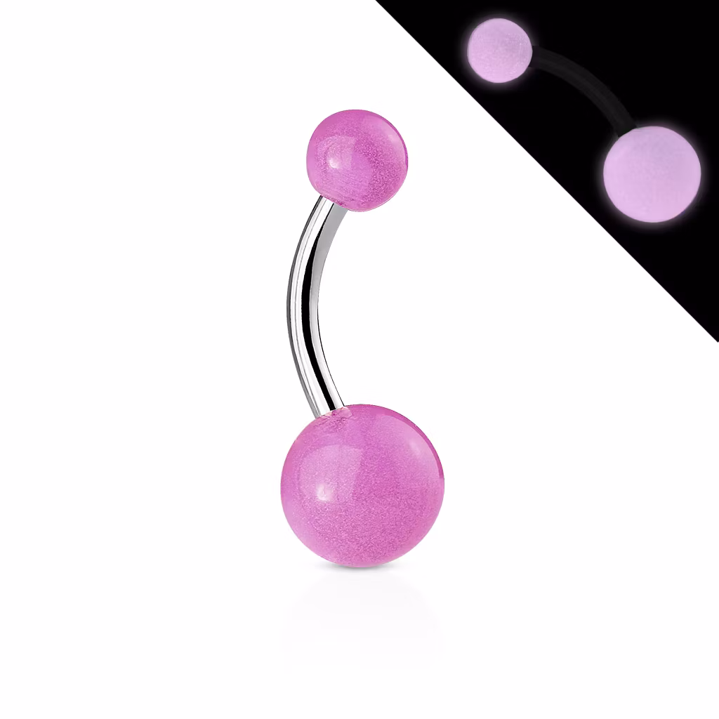 Navelsmycke med banana i 316L kirurgiskt stål. Akrylkulor 5mm och 8mm som lyser i mörkret. 10mm lång stav.