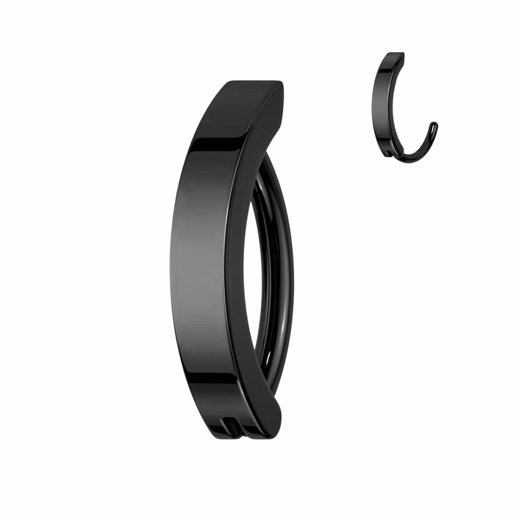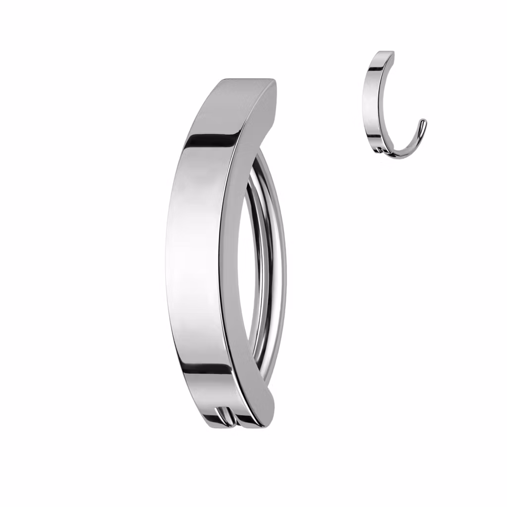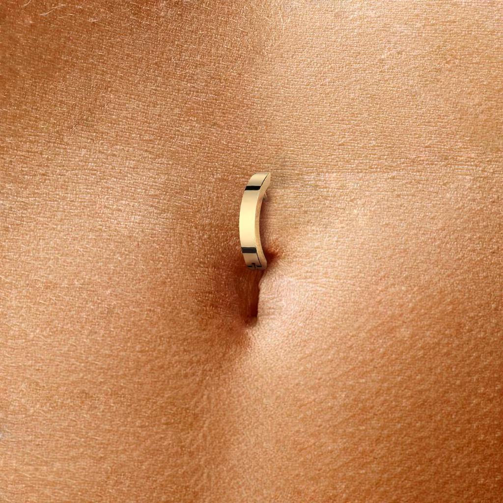 Navelsmycke i form av ett clips som är lätt böjt. Sitter med en böjd stav som är försedd med ett gångjärn för enklare användning.